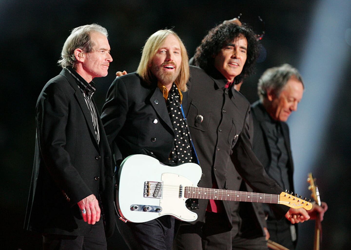 Bridgestone Super Bowl XLII Halftime Show GLENDALE, AZ - FEBRUARY 03: (L-R) Keyboardist Benmont Tench, singer/songwriter Tom Petty, guitarist Mike Campbell and guitarist Scott Thurston smile after perforiming at the Bridgestone halftime show during Super Bowl XLII between the New York Giants and the New England Patriots on February 3, 2008 at the University of Phoenix Stadium in Glendale, Arizona. (Photo by Streeter Lecka/Getty Images) (Streeter Lecka/Getty Images)