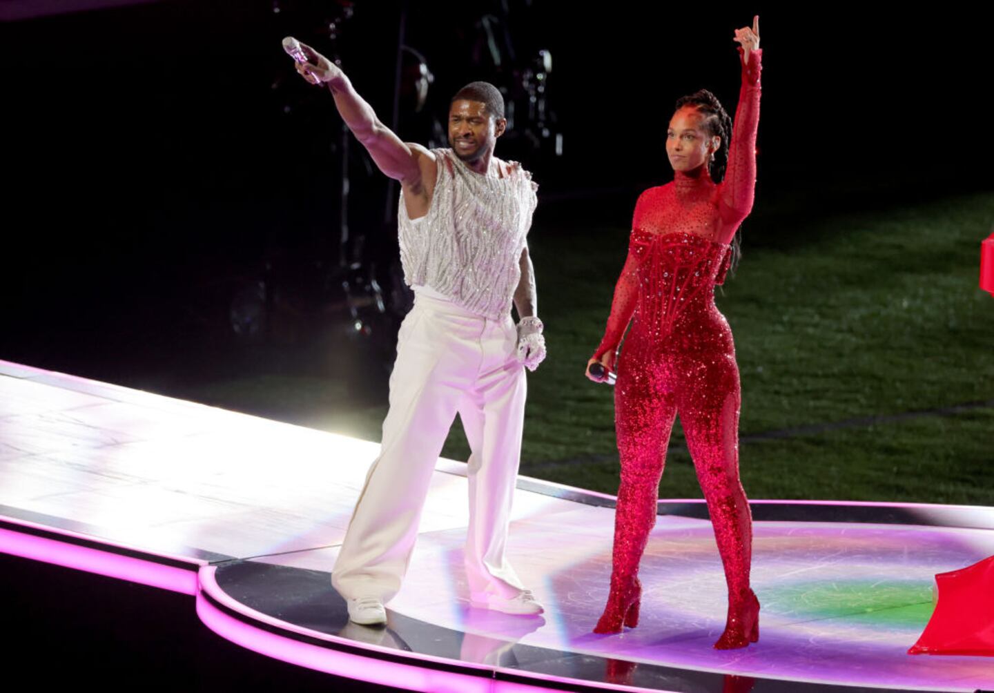 Apple Music Super Bowl LVIII Halftime Show LAS VEGAS, NEVADA - FEBRUARY 11: (L-R) Usher and Alicia Keys perform onstage during the Apple Music Super Bowl LVIII Halftime Show at Allegiant Stadium on February 11, 2024 in Las Vegas, Nevada. (Photo by Ezra Shaw/Getty Images) (Ezra Shaw/Getty Images)