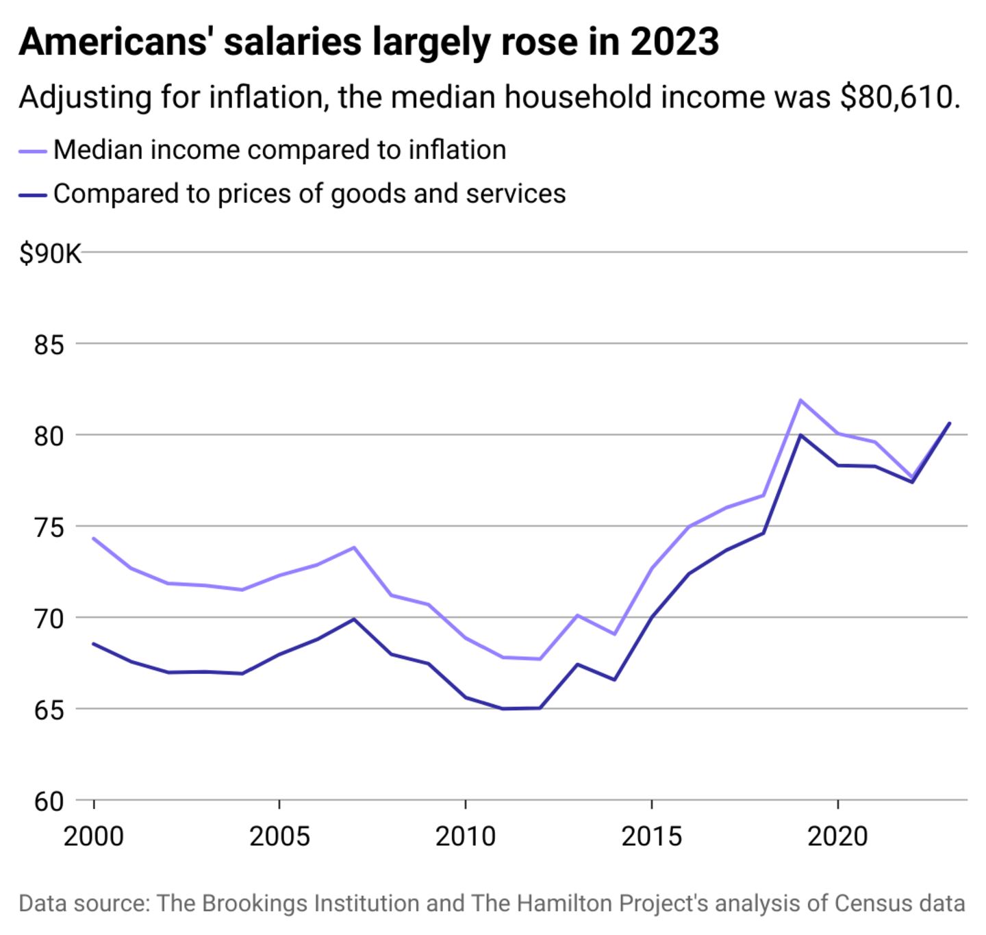 That's where wages come in. Using both measurements, the typical household earned more than $80,000 in 2023, according to analysis from the Brookings Institution and The Hamilton Project. That's a big jump from 2020, when the median household income was $68,000.