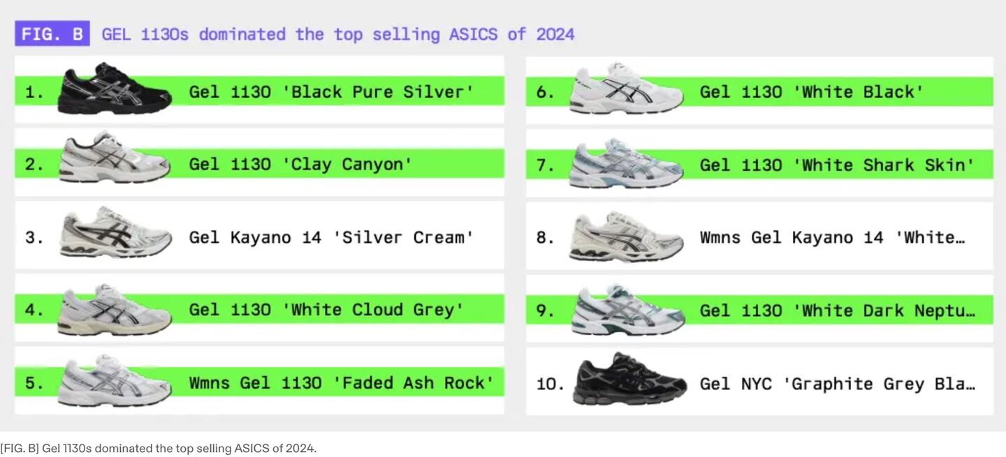 ASICS sales and trend data is gathered by alias, the official selling app of GOAT and Flight Club, as a part of their 2025 Market Report, recording events that occurred across the three platforms between January 1 and October 31, 2024. It is a document of the past and is not intended to contain predictions or guarantees of future trends or buyer behavior. All information is included as-is and without obligation to update. No endorsement, sponsorship, or association is implied by inclusion in the report contents.