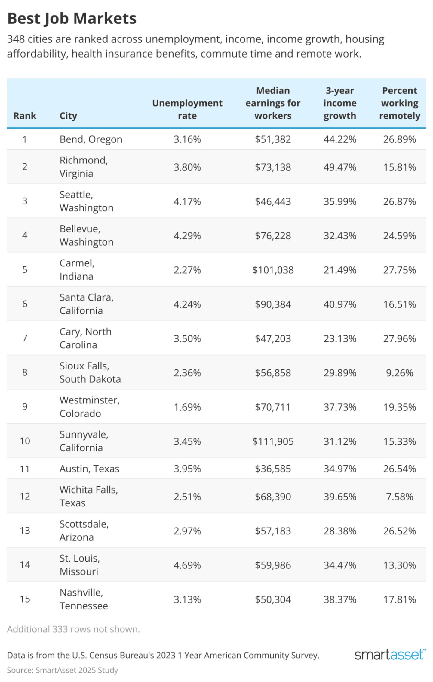 With this in mind, SmartAsset ranked 348 U.S. cities based on six metrics from the latest Census Bureau data to help households determine which job markets might be most suitable for their financial goals.