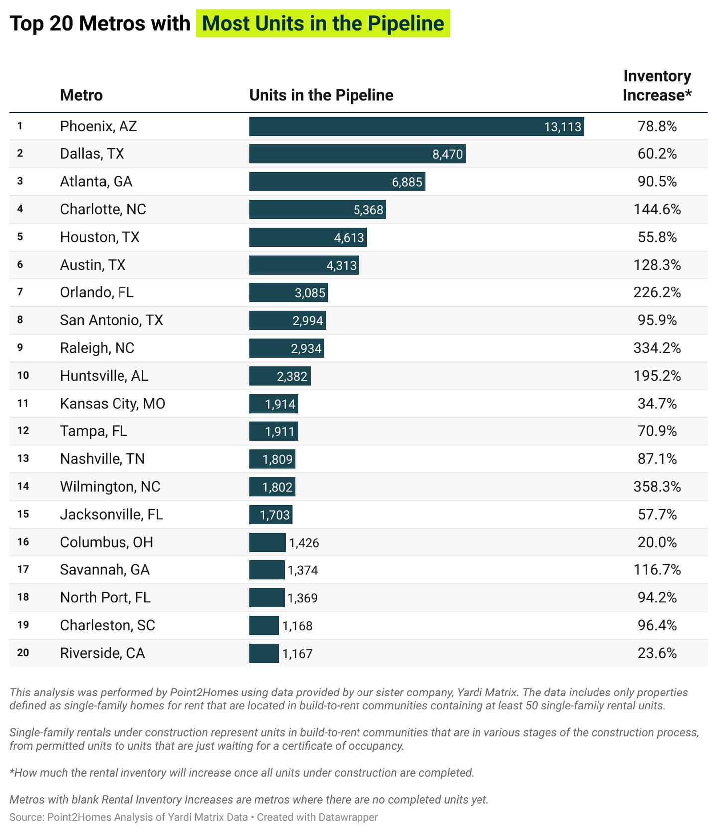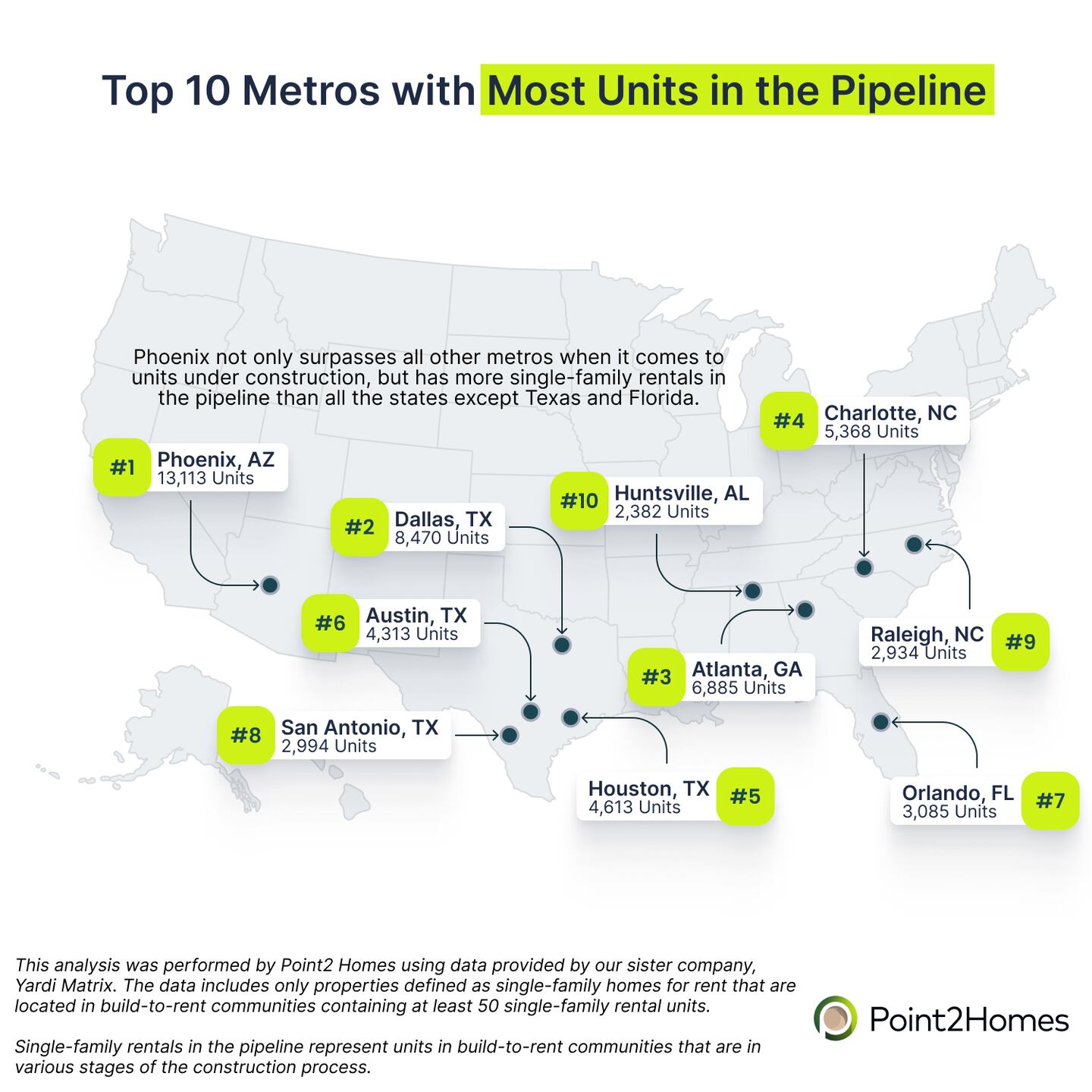 This analysis was performed by Point2Homes using data provided by our sister company, Yardi Matrix. The data includes only properties defined as single-family homes for rent that are located in build-to-rent, professionally managed communities in the markets covered by Yardi Matrix research. Data for some markets may not be available and data for the locations included in the analysis may be subject to change. This analysis does not include other types of single-family rentals that are not located in build-to-rent communities.