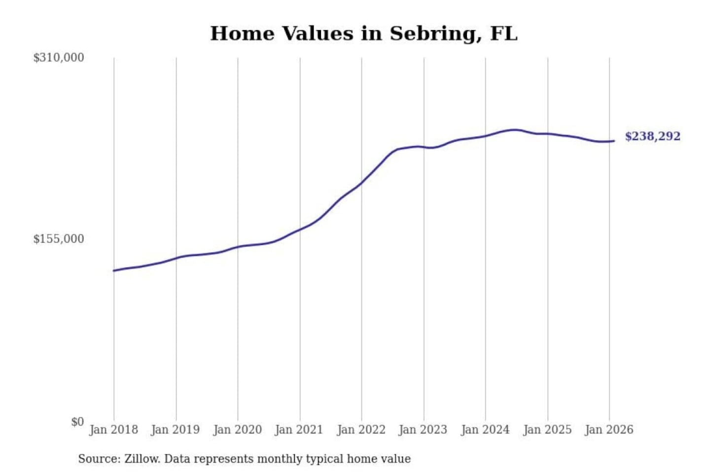 Stacker compiled a list of cities with the most expensive homes in the Sebring-Avon Park, FL metro area using data from Zillow. Charts show the monthly typical home value since January 2018.