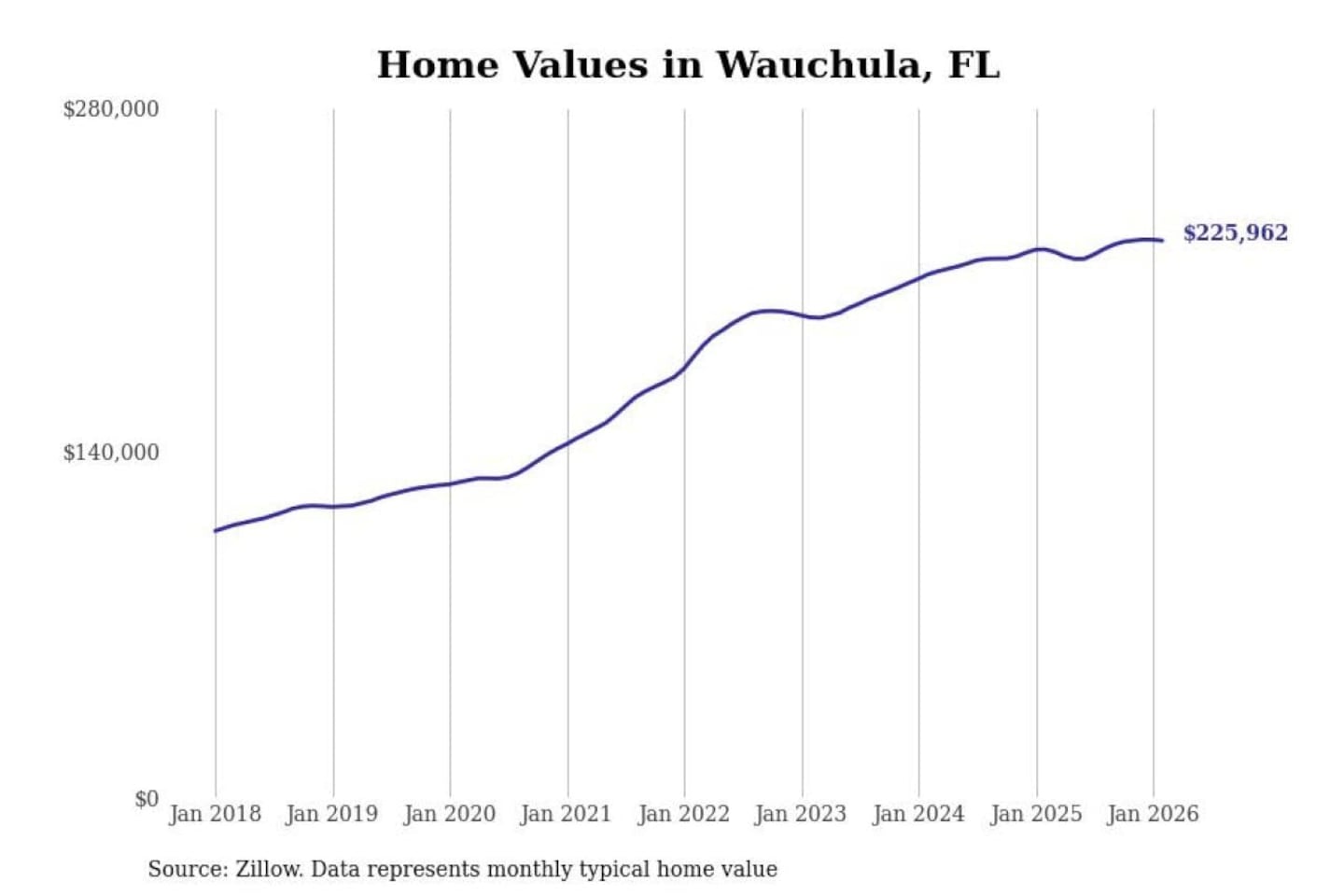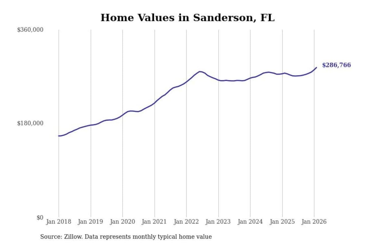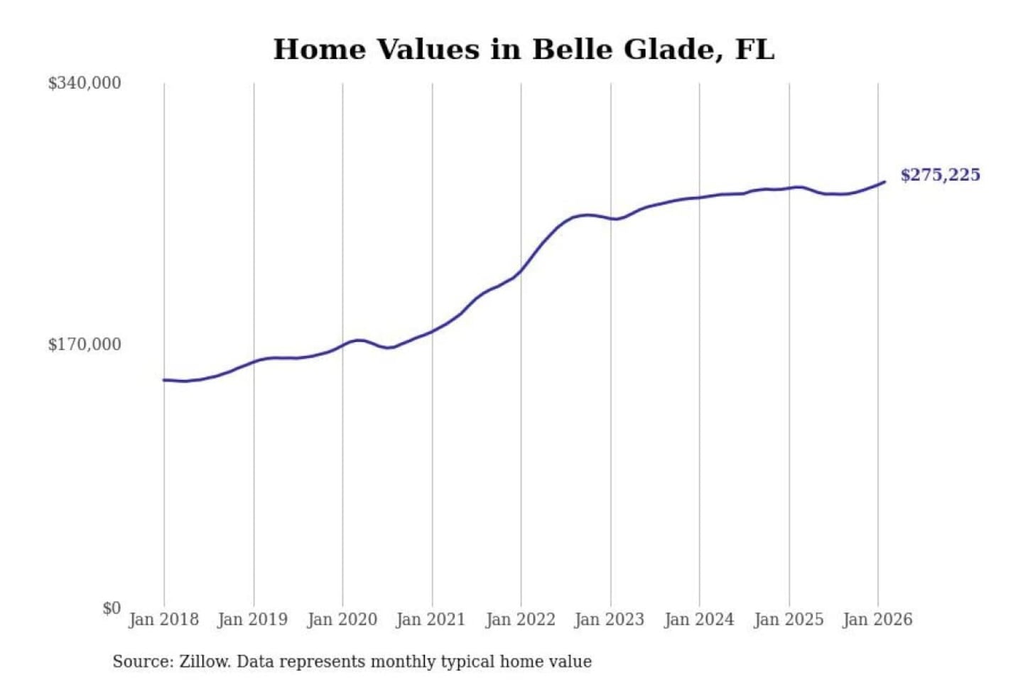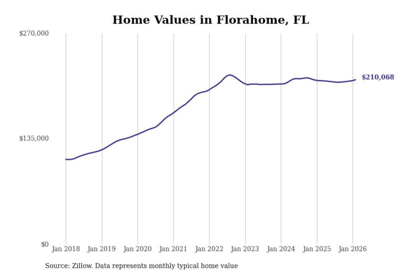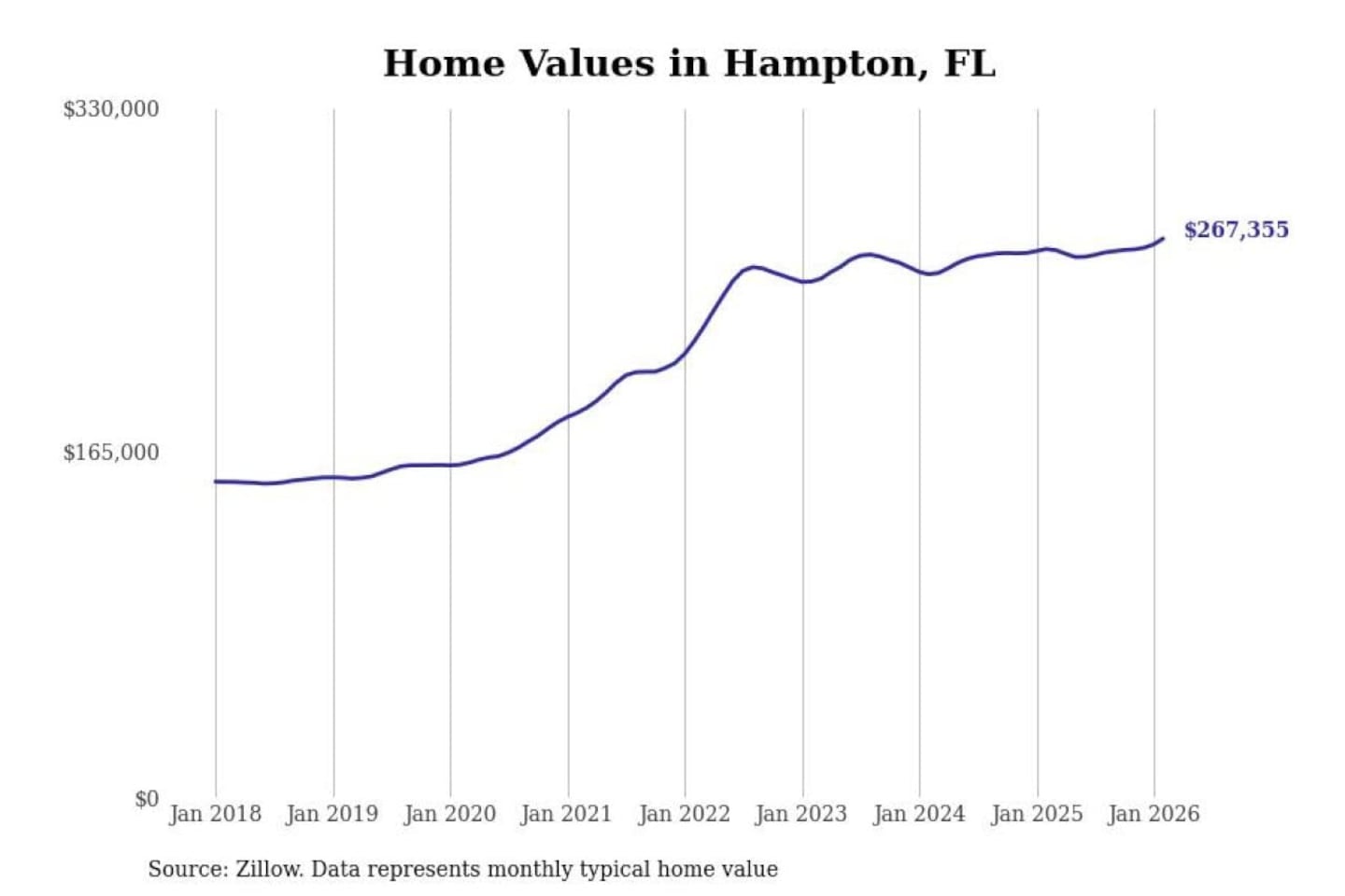 Stacker compiled a list of cities with the fastest-growing home prices in Florida using data from Zillow. Cities are ranked by the dollar change in the Zillow Home Values Index for all homes from the 12 months ending February 2026. The charts in this story were created automatically using Matplotlib. Data was available for 50 cities and towns in Florida.