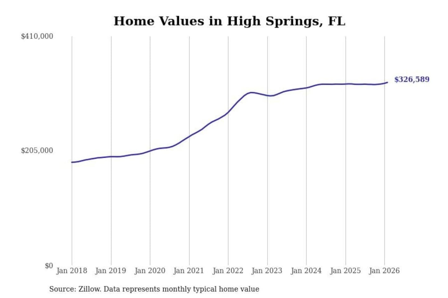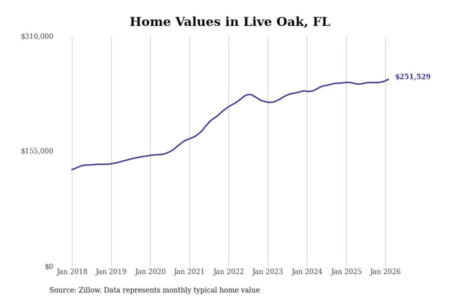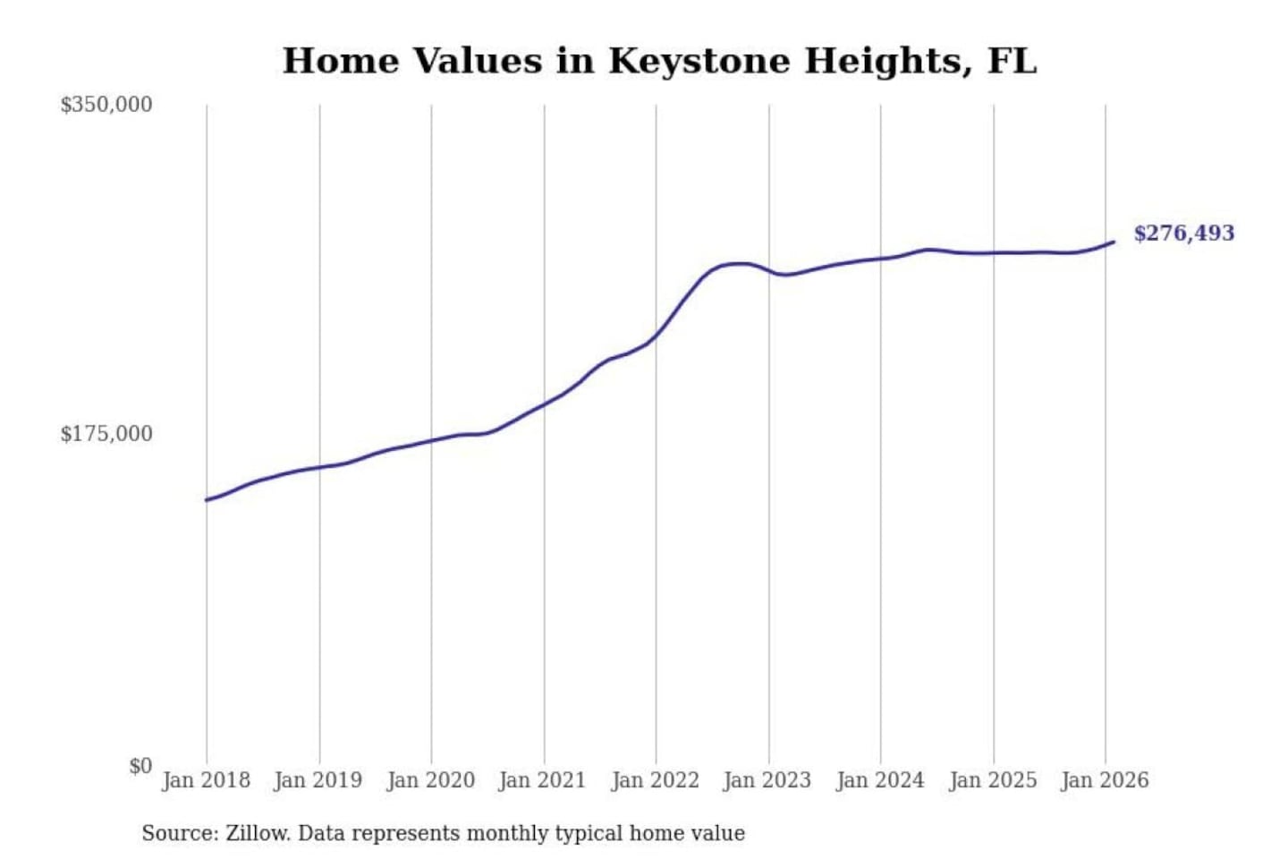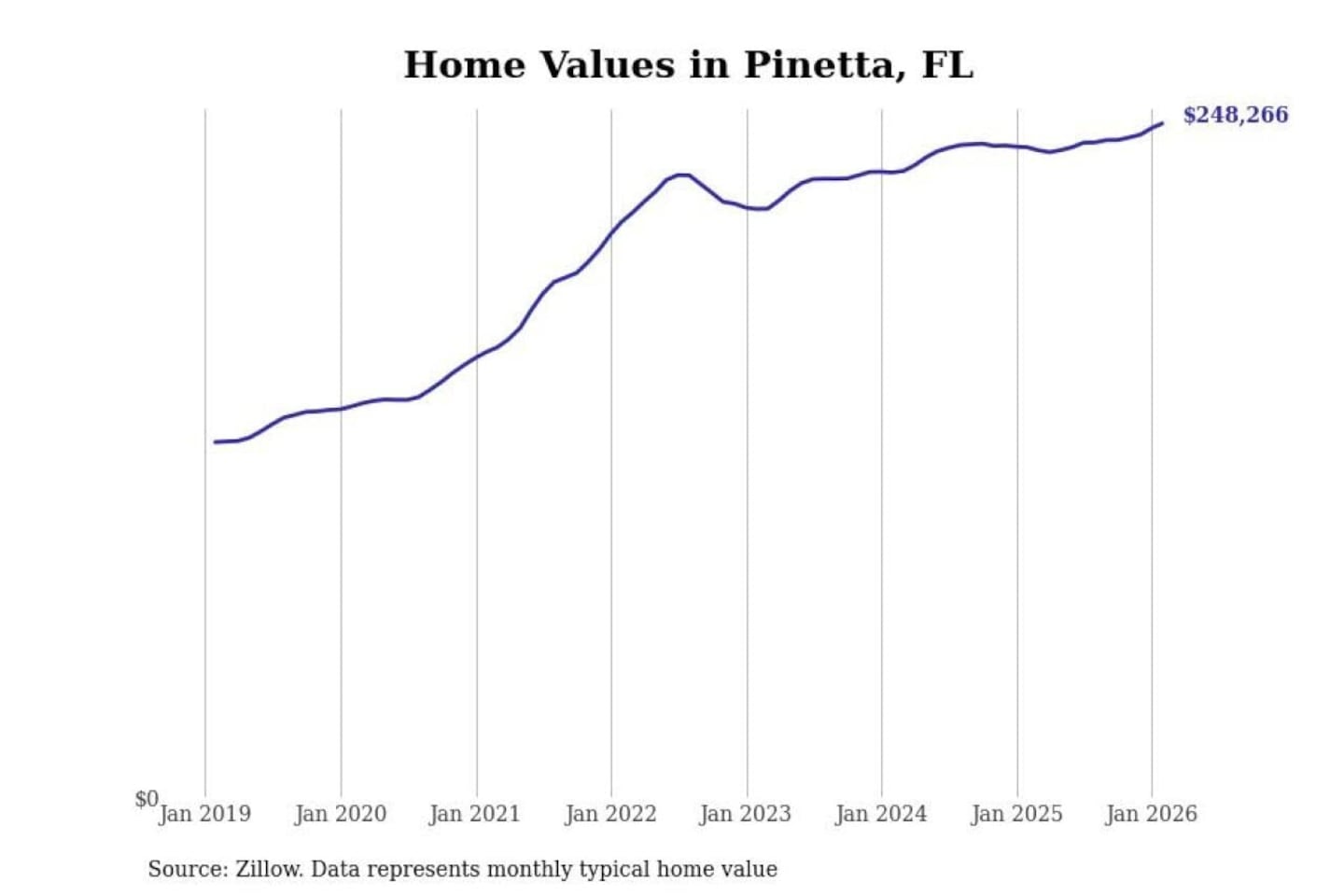 Stacker compiled a list of cities with the fastest-growing home prices in Florida using data from Zillow. Cities are ranked by the dollar change in the Zillow Home Values Index for all homes from the 12 months ending February 2026. The charts in this story were created automatically using Matplotlib. Data was available for 50 cities and towns in Florida.