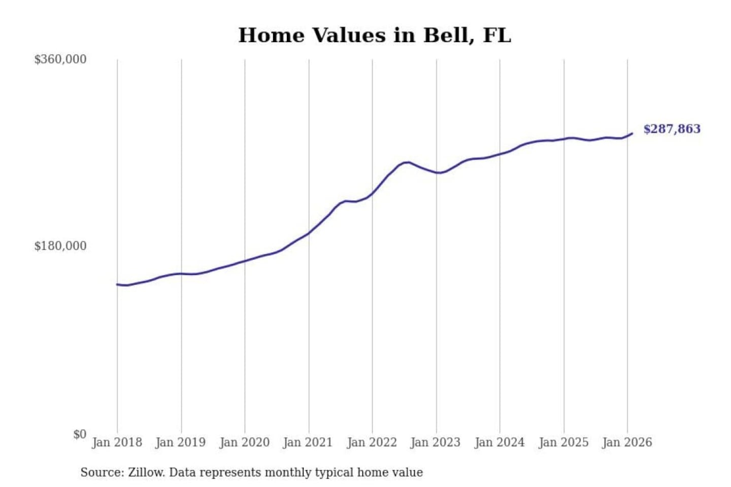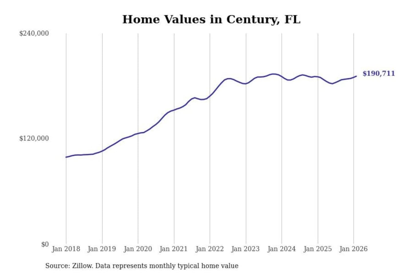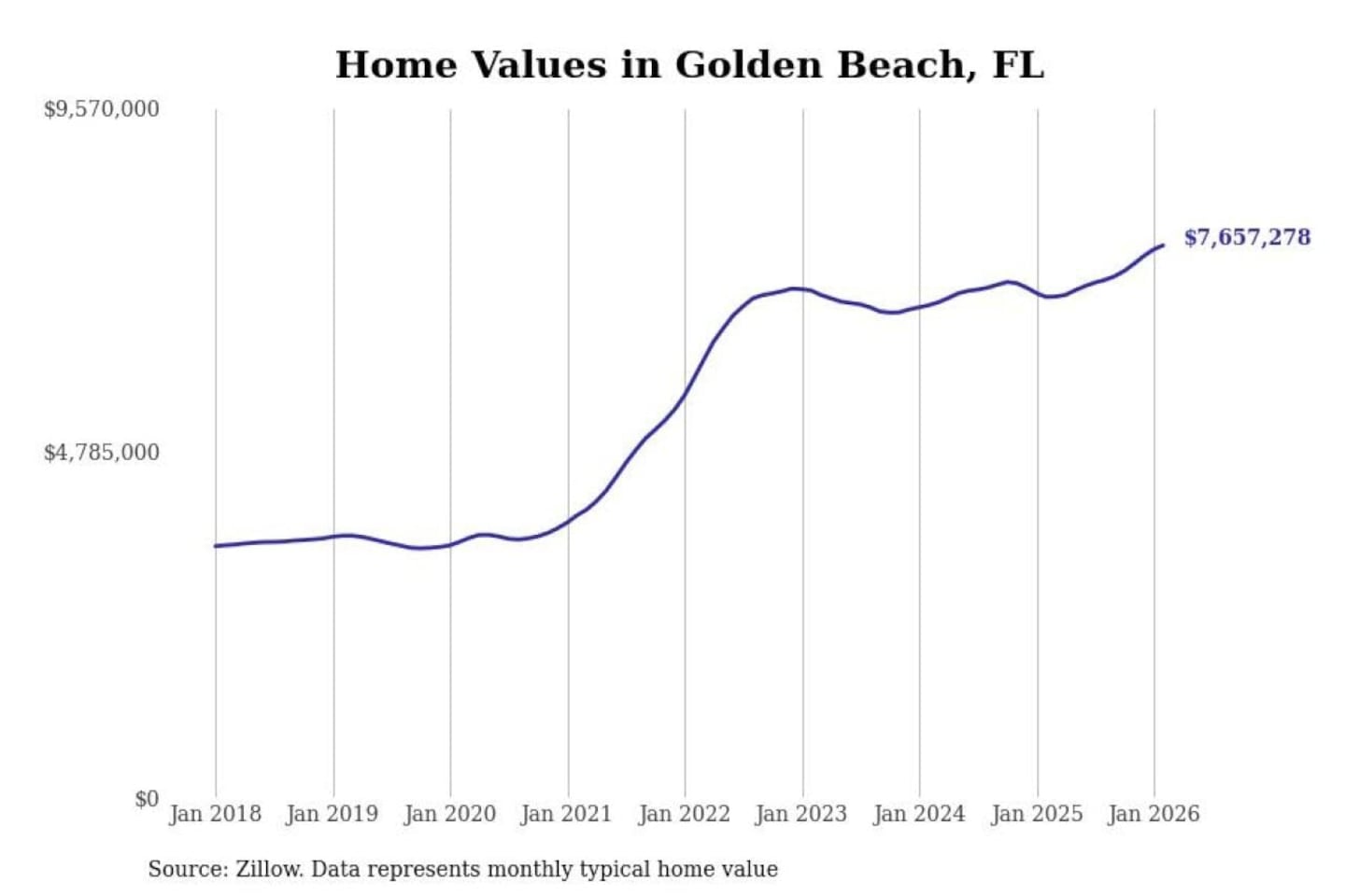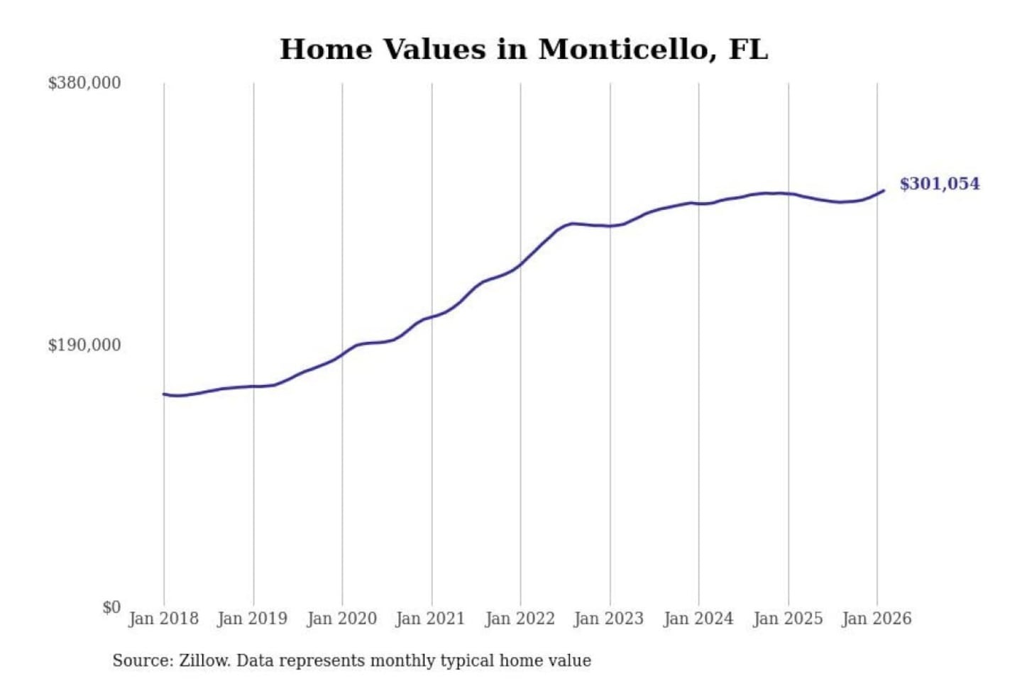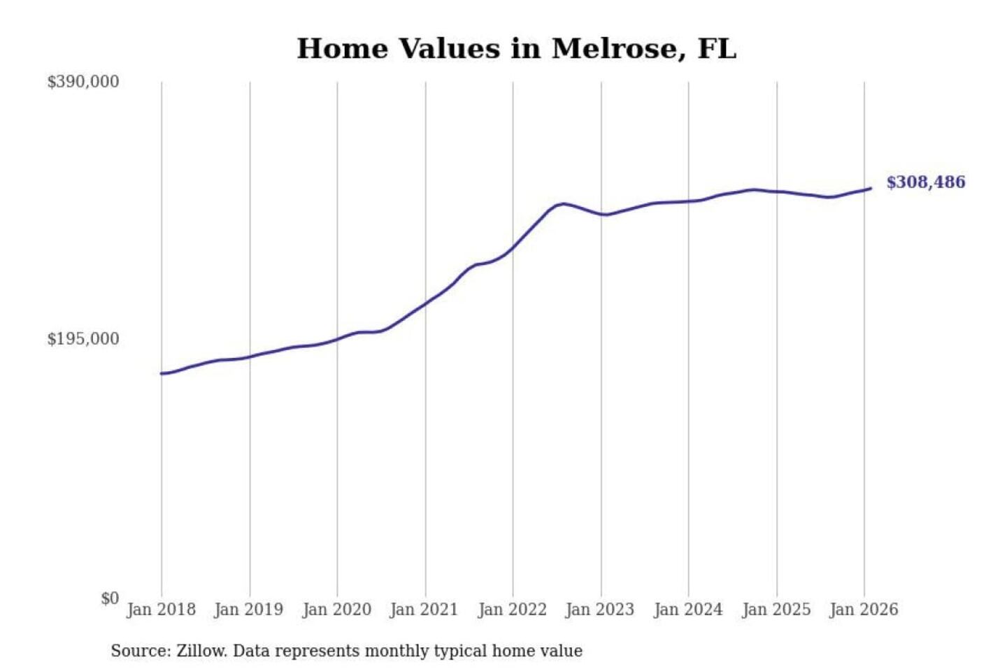 Stacker compiled a list of cities with the fastest-growing home prices in Florida using data from Zillow. Cities are ranked by the dollar change in the Zillow Home Values Index for all homes from the 12 months ending February 2026. The charts in this story were created automatically using Matplotlib. Data was available for 50 cities and towns in Florida.
