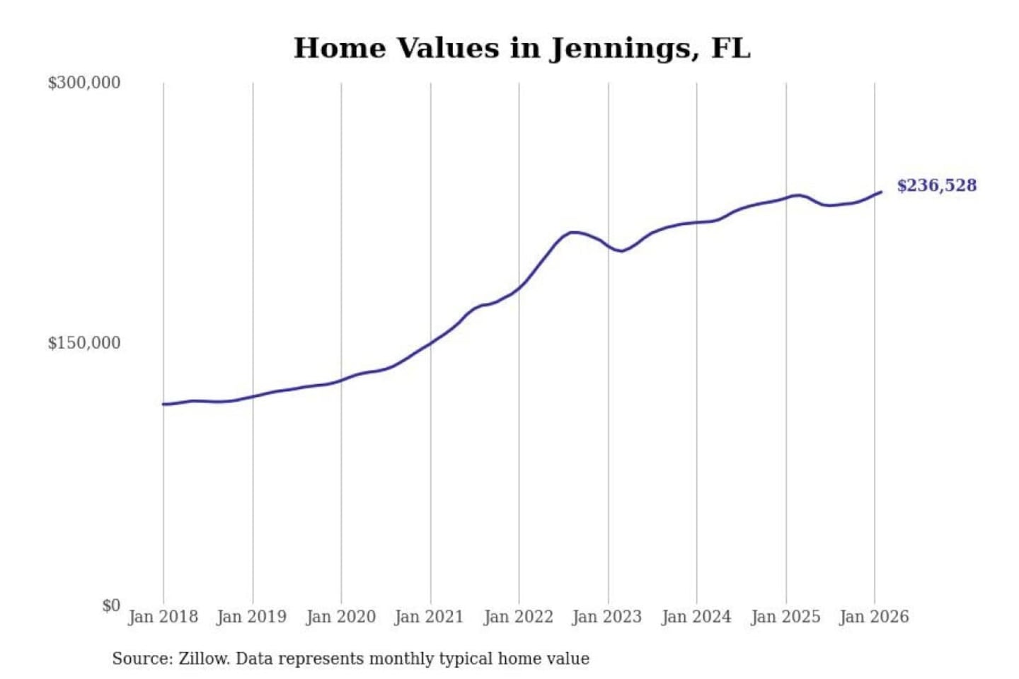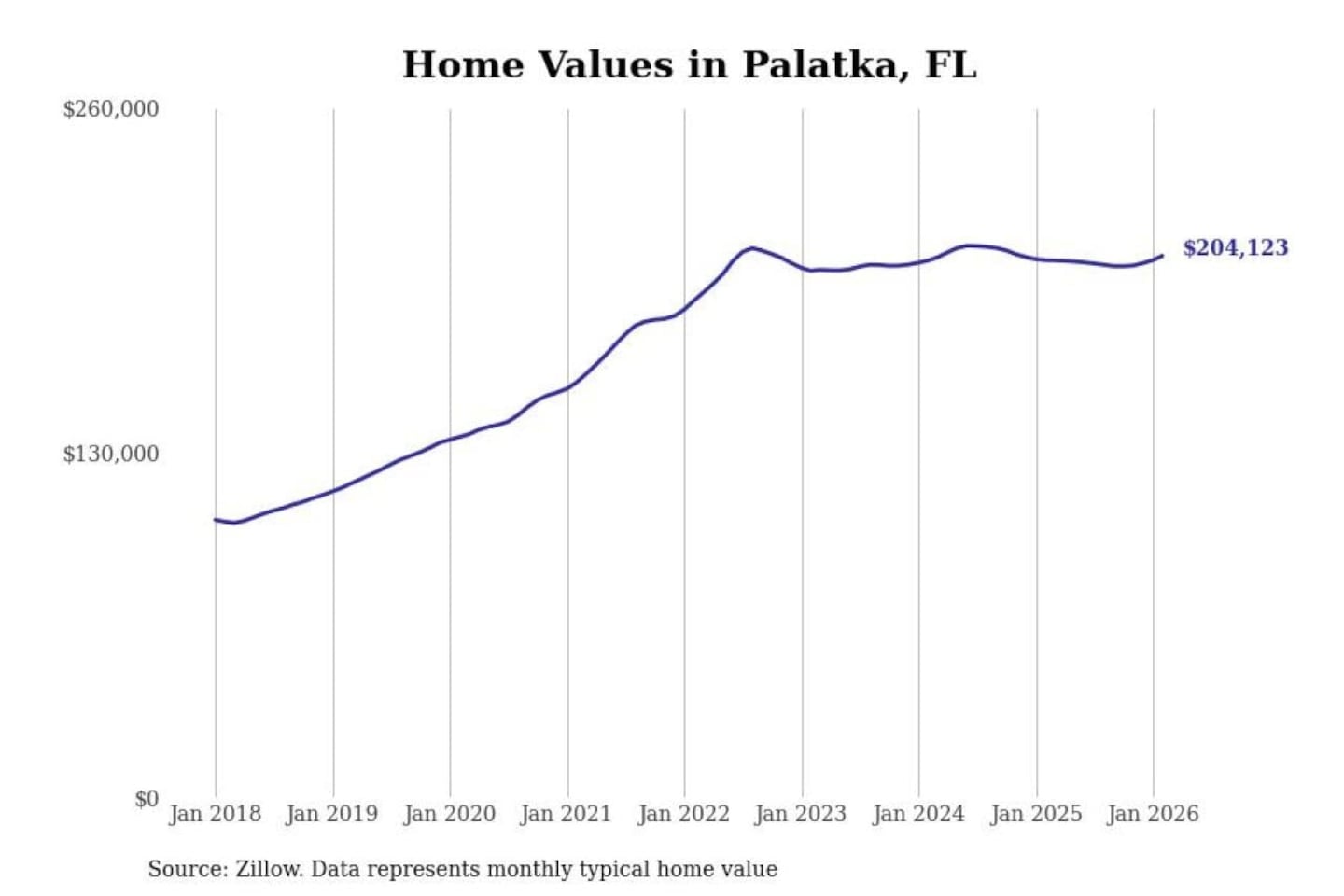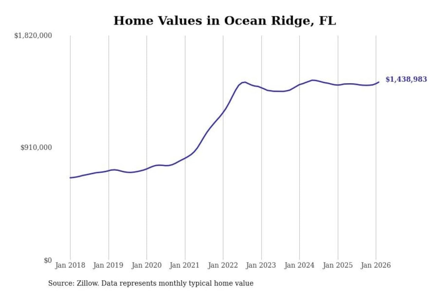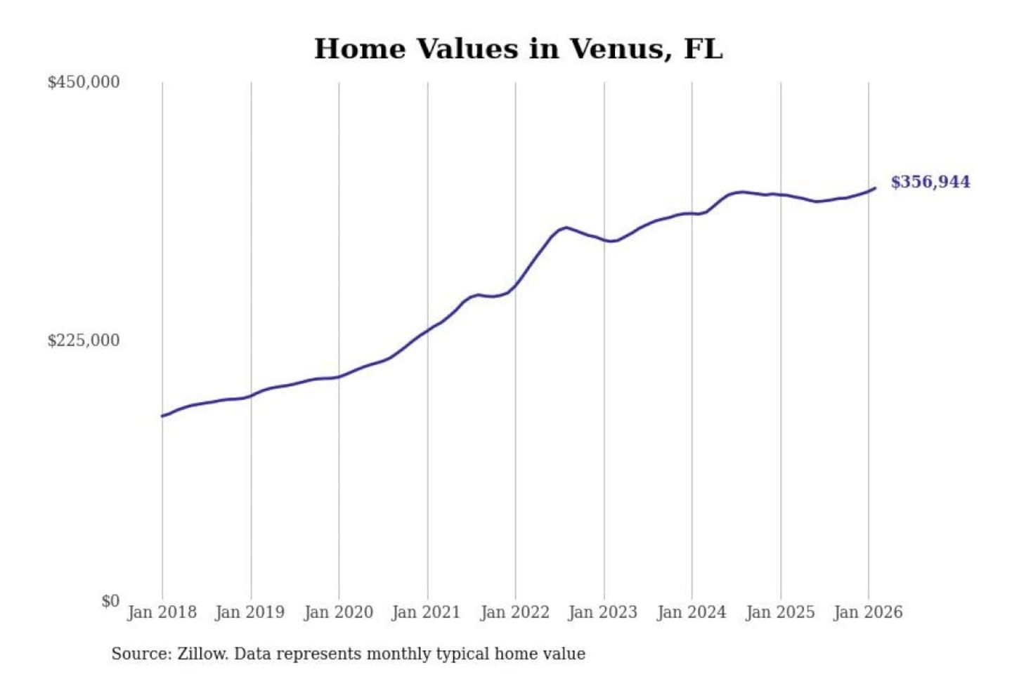 Stacker compiled a list of cities with the fastest-growing home prices in Florida using data from Zillow. Cities are ranked by the dollar change in the Zillow Home Values Index for all homes from the 12 months ending February 2026. The charts in this story were created automatically using Matplotlib. Data was available for 50 cities and towns in Florida.
