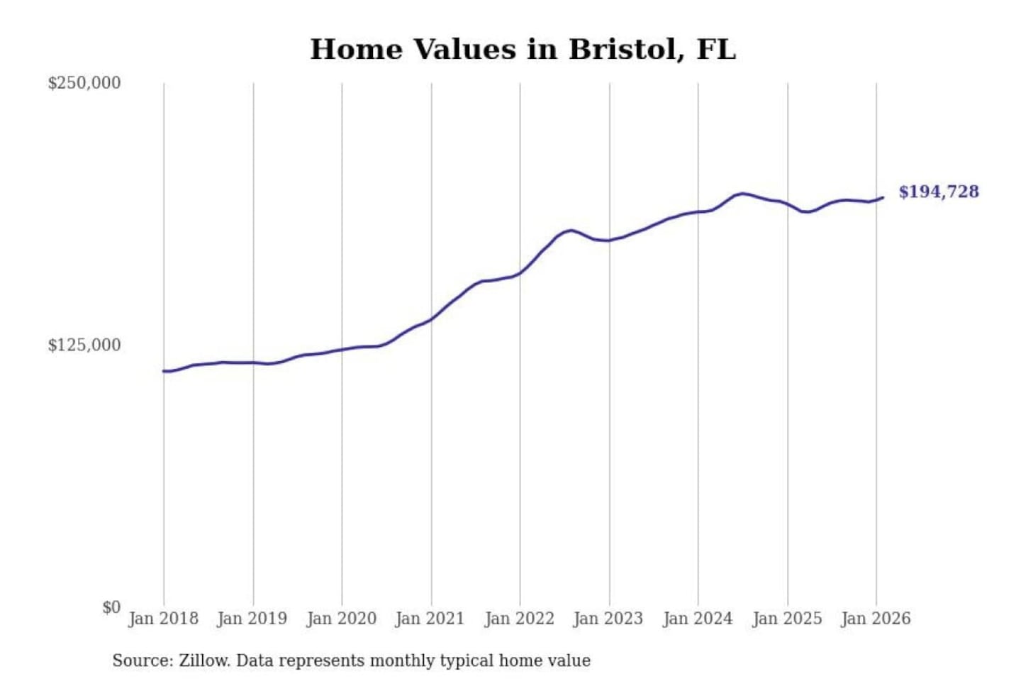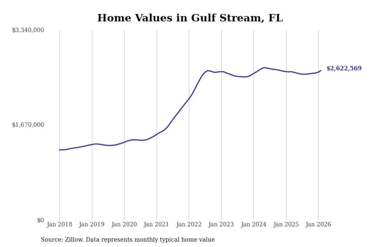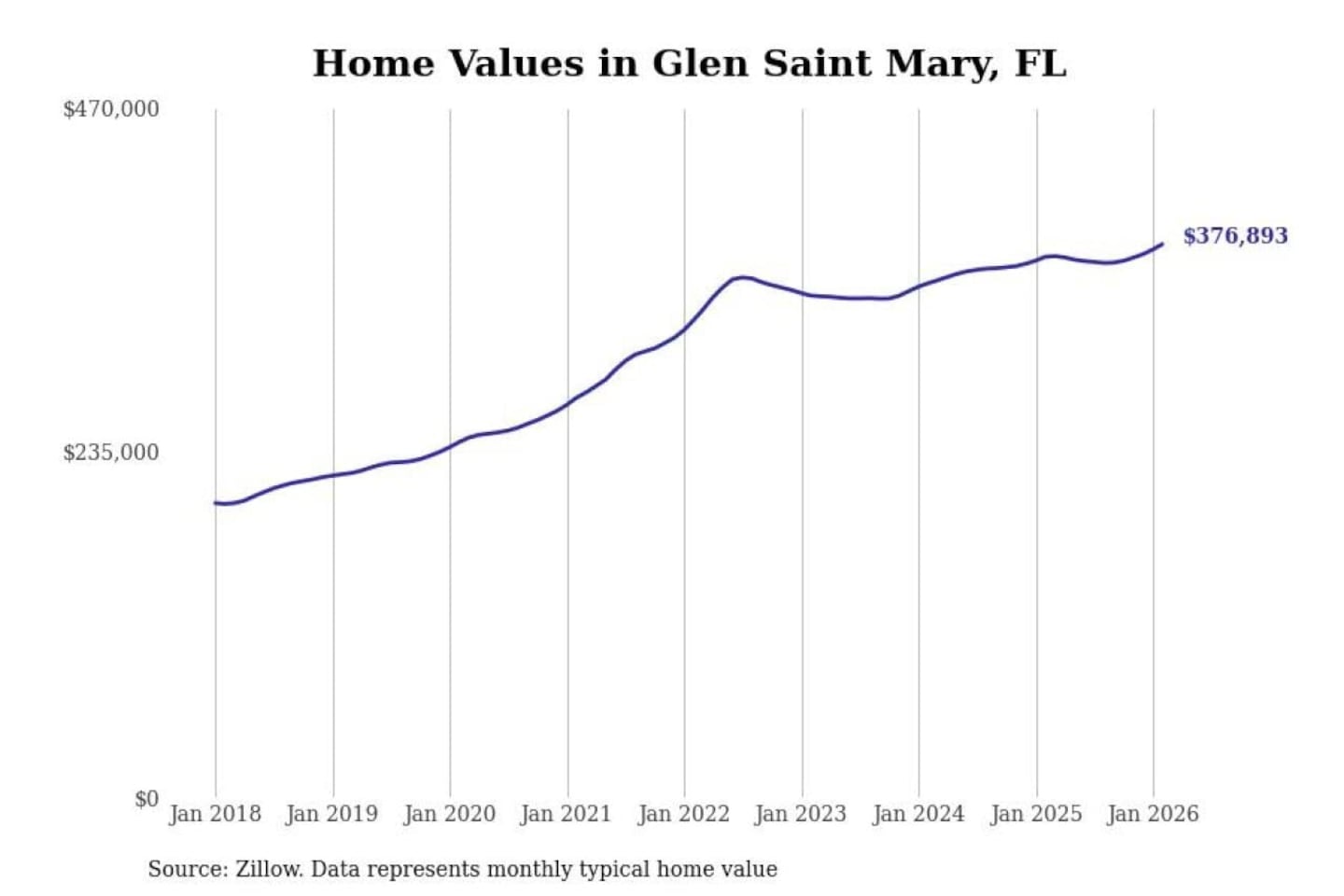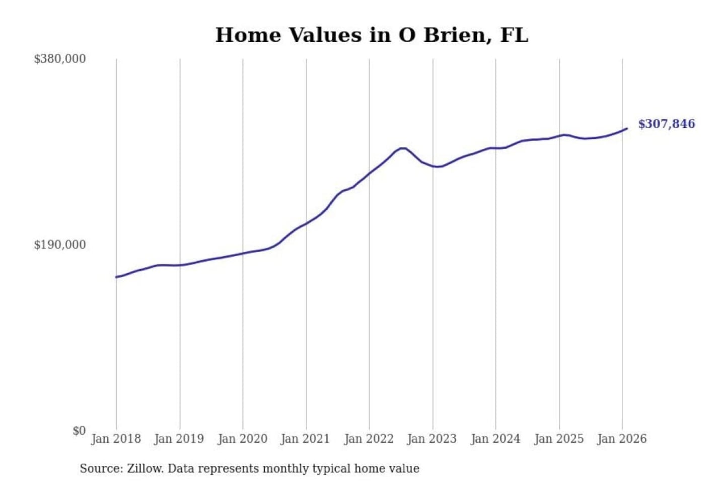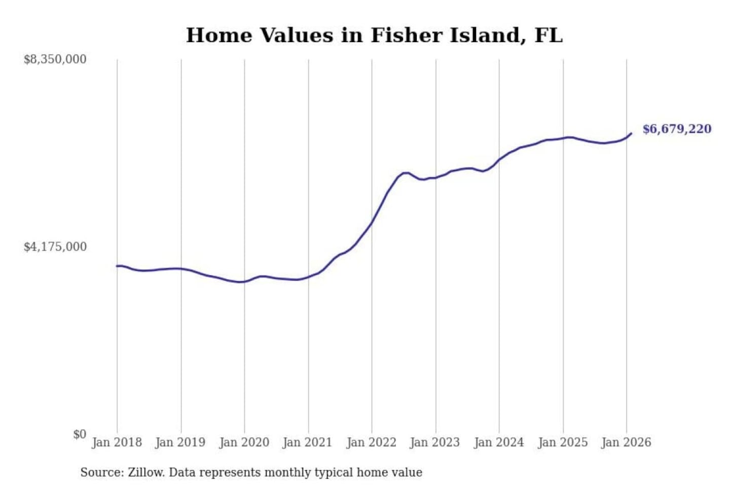 Stacker compiled a list of cities with the fastest-growing home prices in Florida using data from Zillow. Cities are ranked by the dollar change in the Zillow Home Values Index for all homes from the 12 months ending February 2026. The charts in this story were created automatically using Matplotlib. Data was available for 50 cities and towns in Florida.