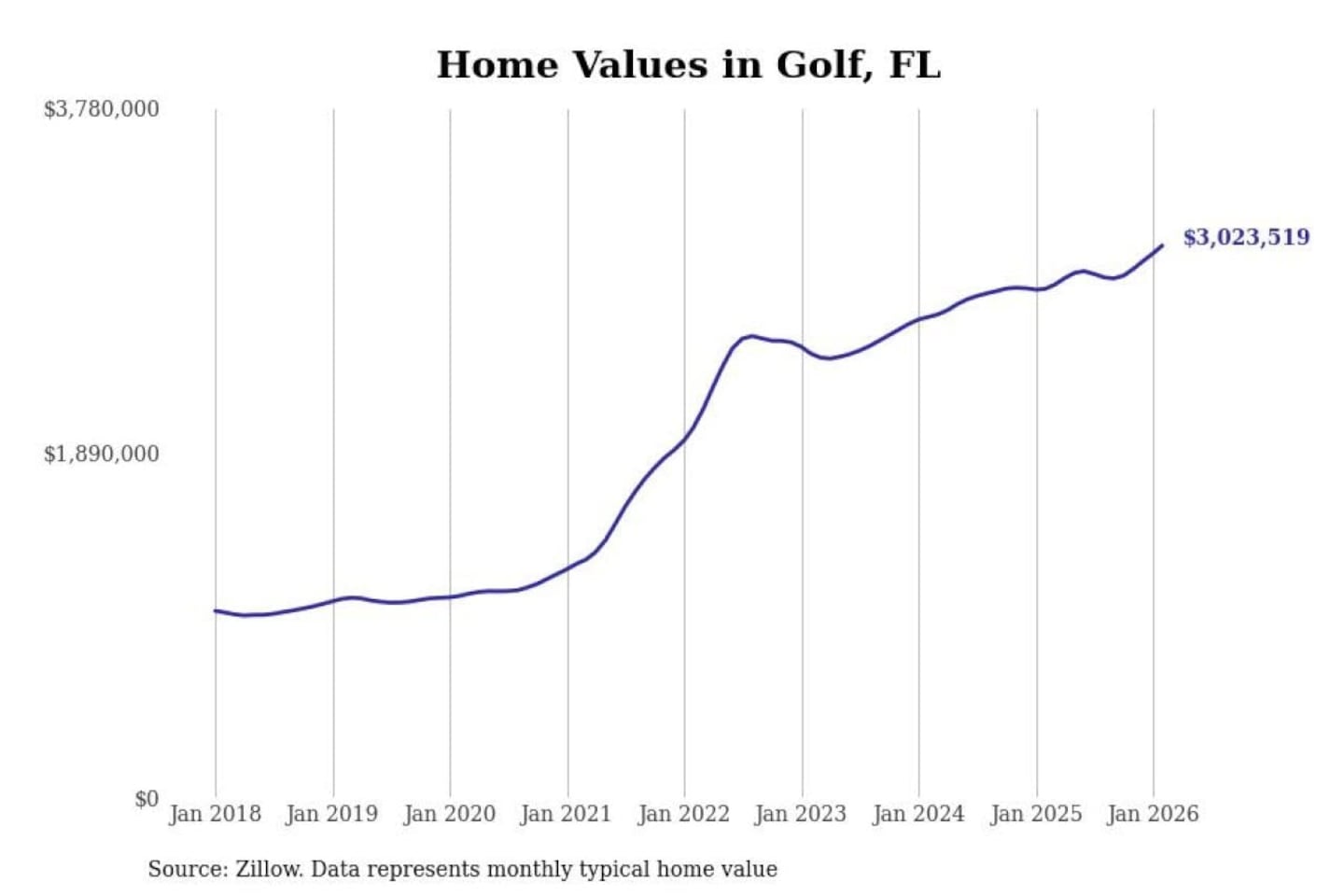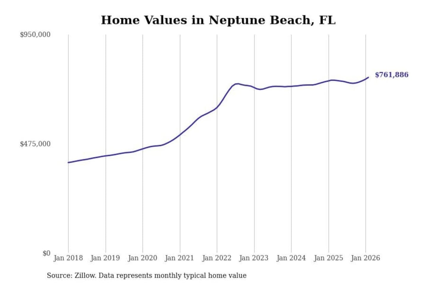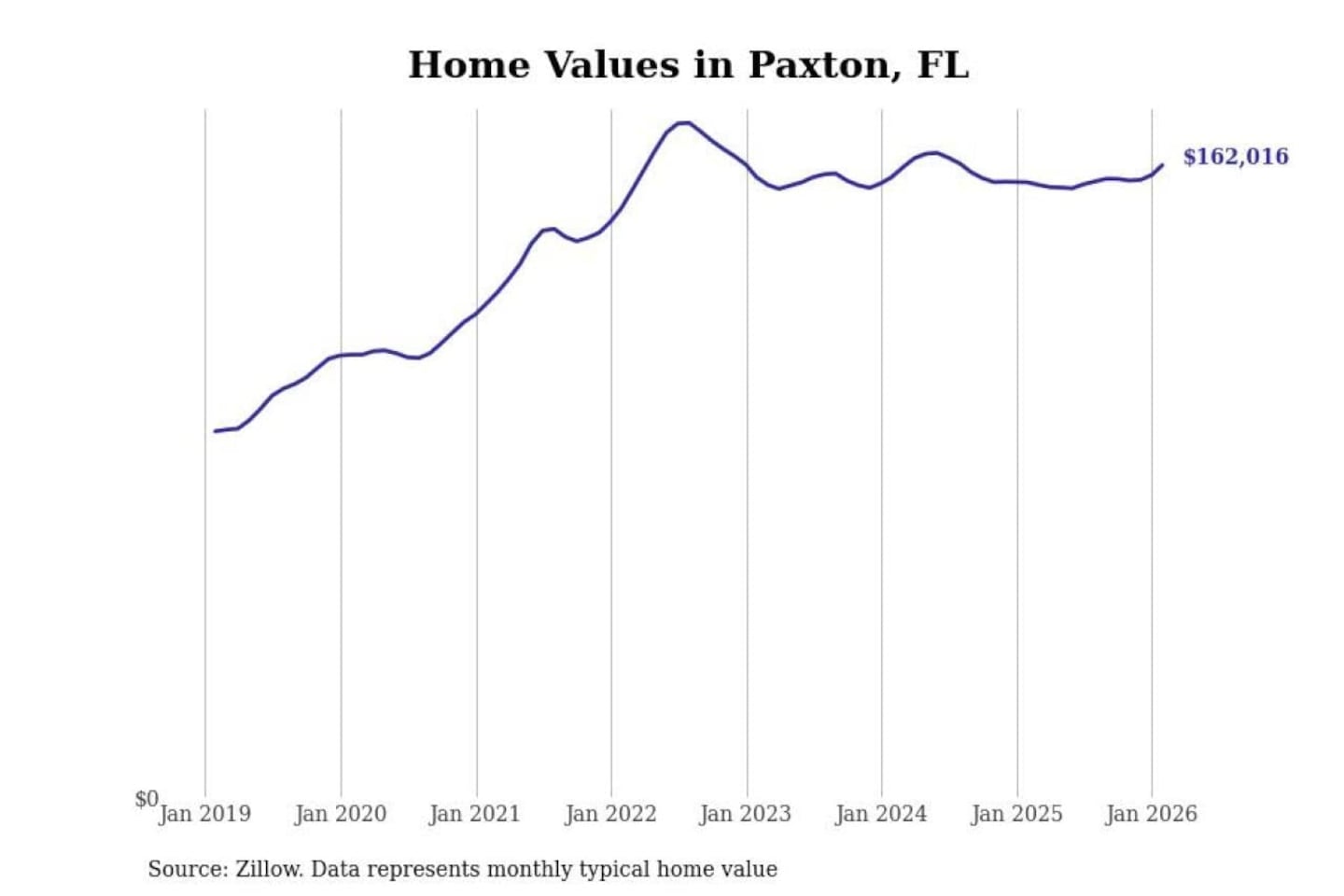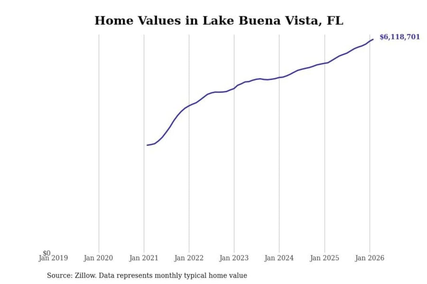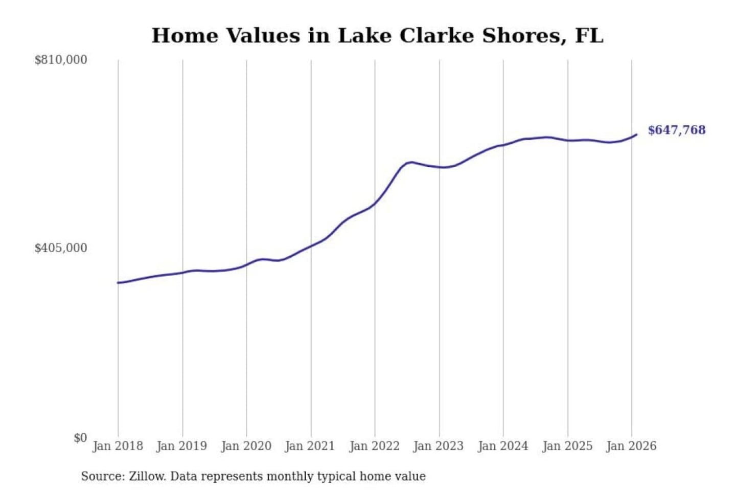 Stacker compiled a list of cities with the fastest-growing home prices in Florida using data from Zillow. Cities are ranked by the dollar change in the Zillow Home Values Index for all homes from the 12 months ending February 2026. The charts in this story were created automatically using Matplotlib. Data was available for 50 cities and towns in Florida.