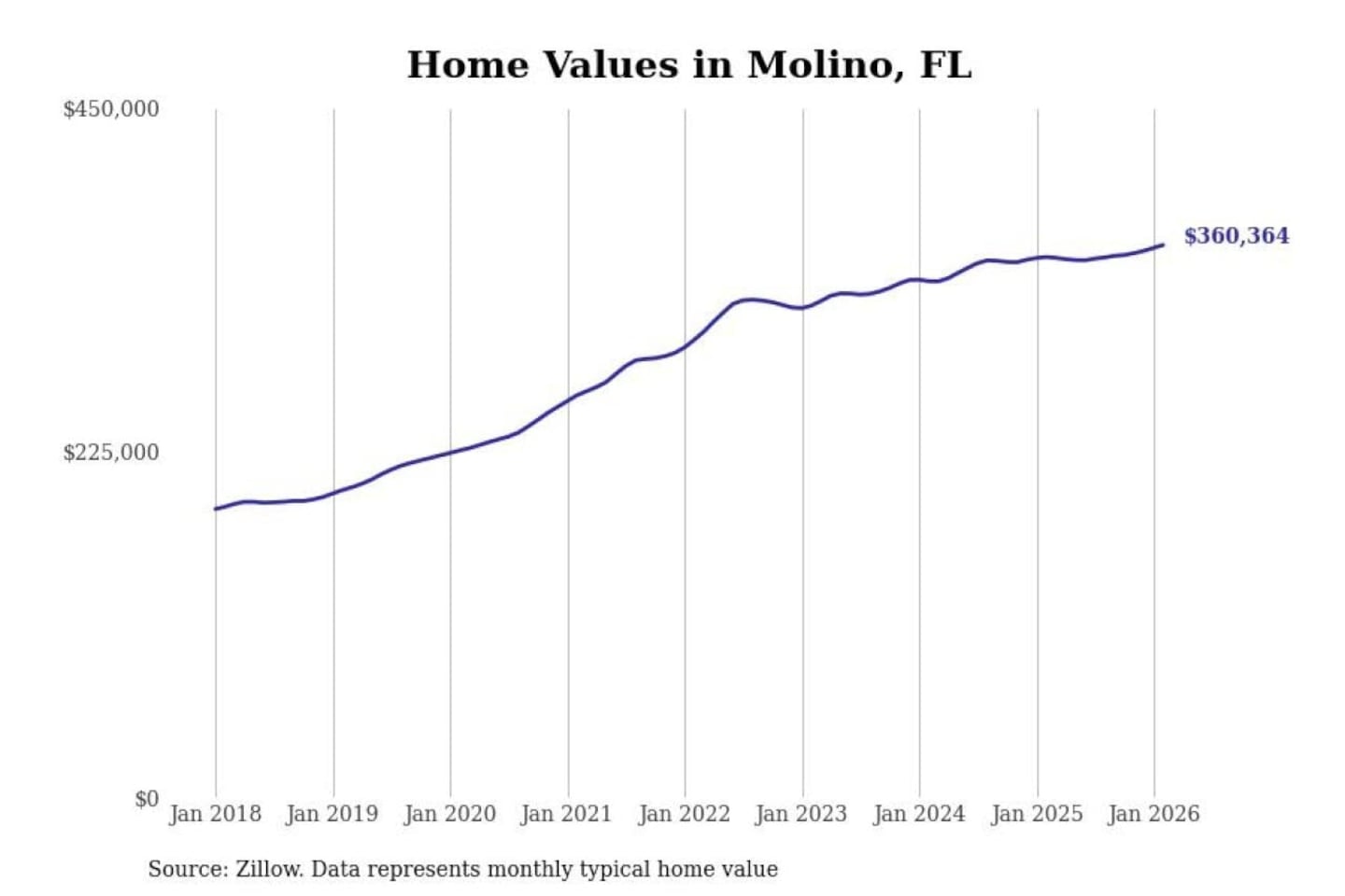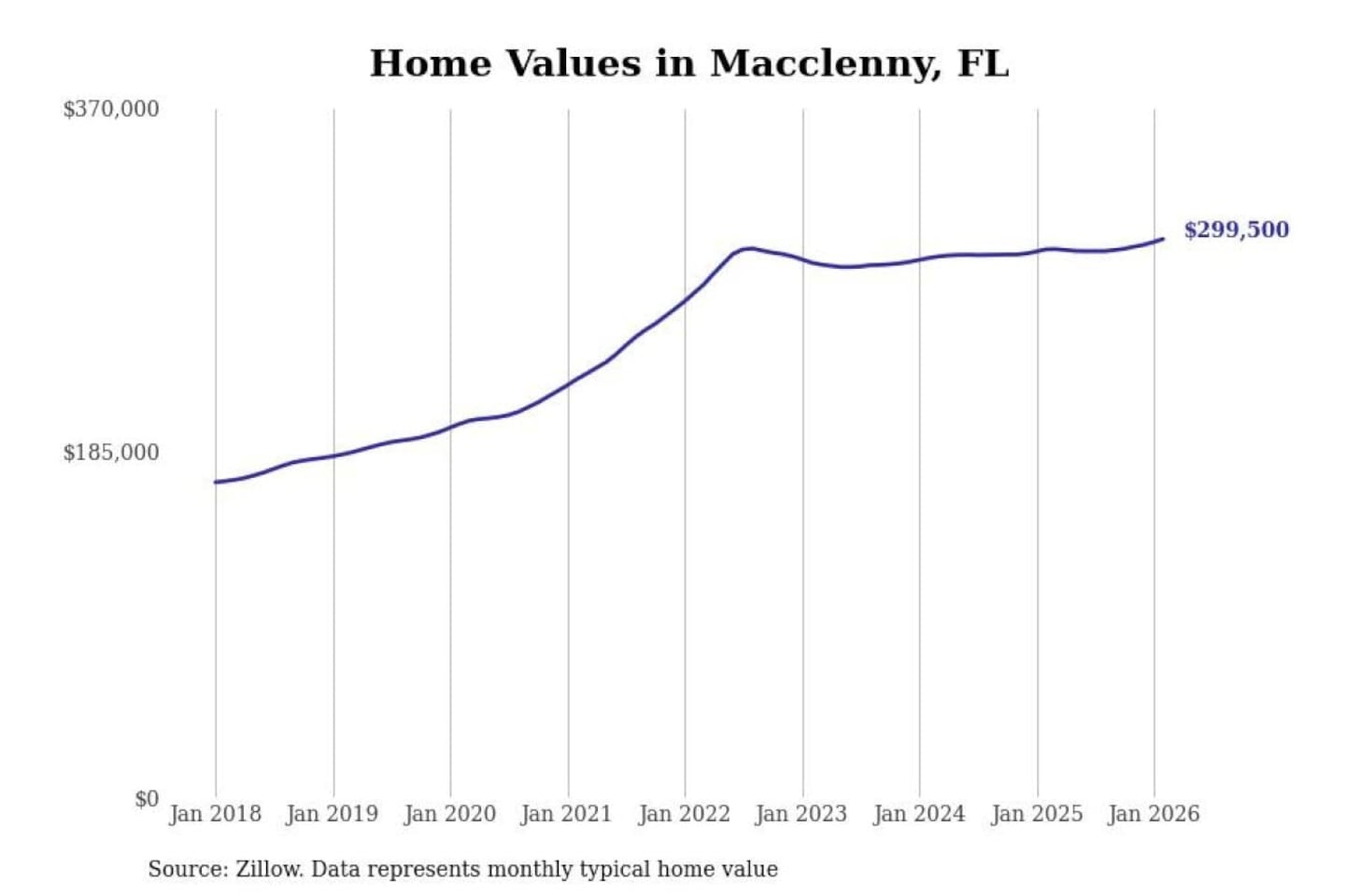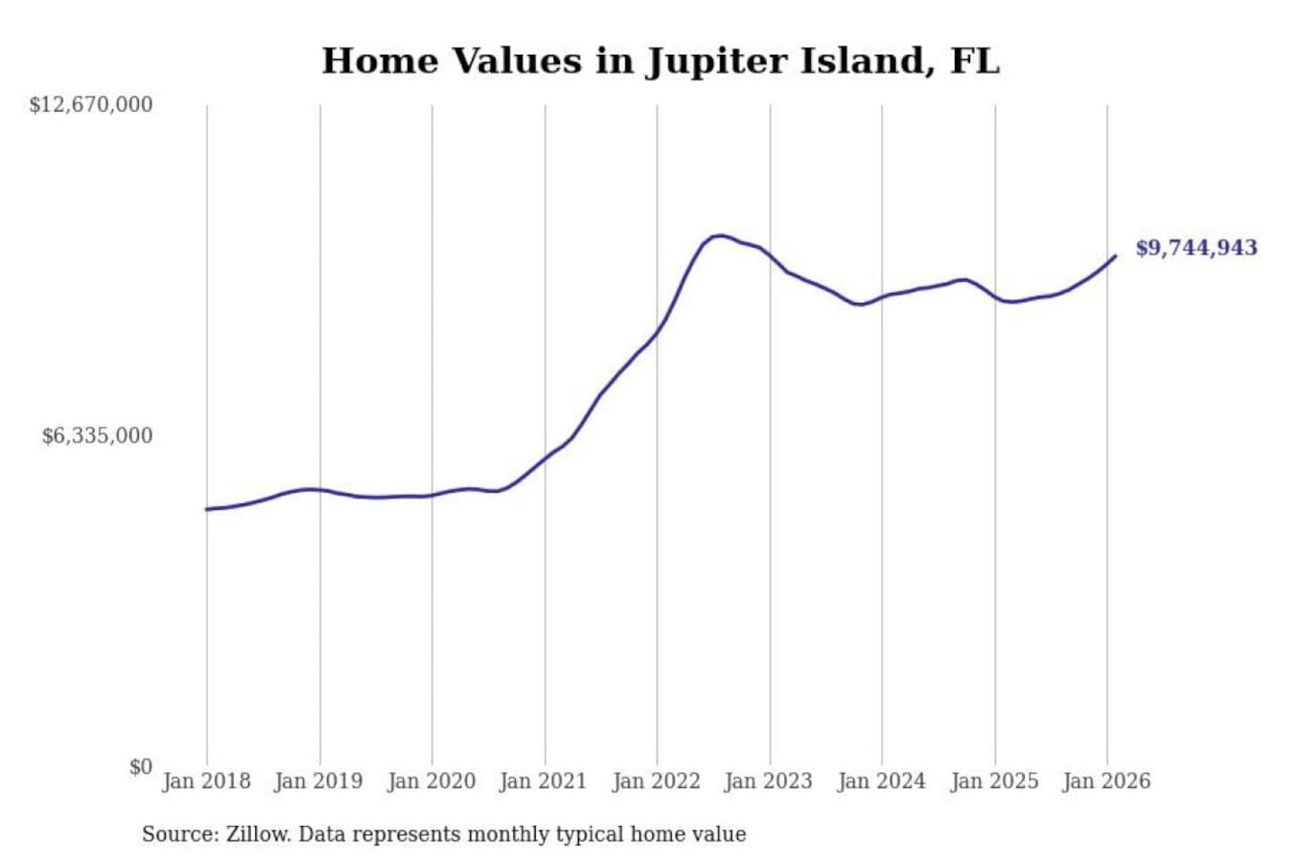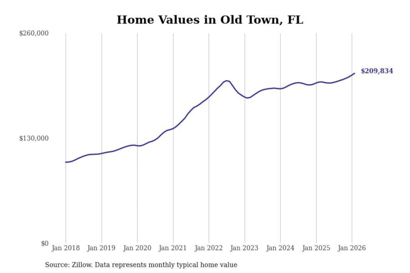 Stacker compiled a list of cities with the fastest-growing home prices in Florida using data from Zillow. Cities are ranked by the dollar change in the Zillow Home Values Index for all homes from the 12 months ending February 2026. The charts in this story were created automatically using Matplotlib. Data was available for 50 cities and towns in Florida.
