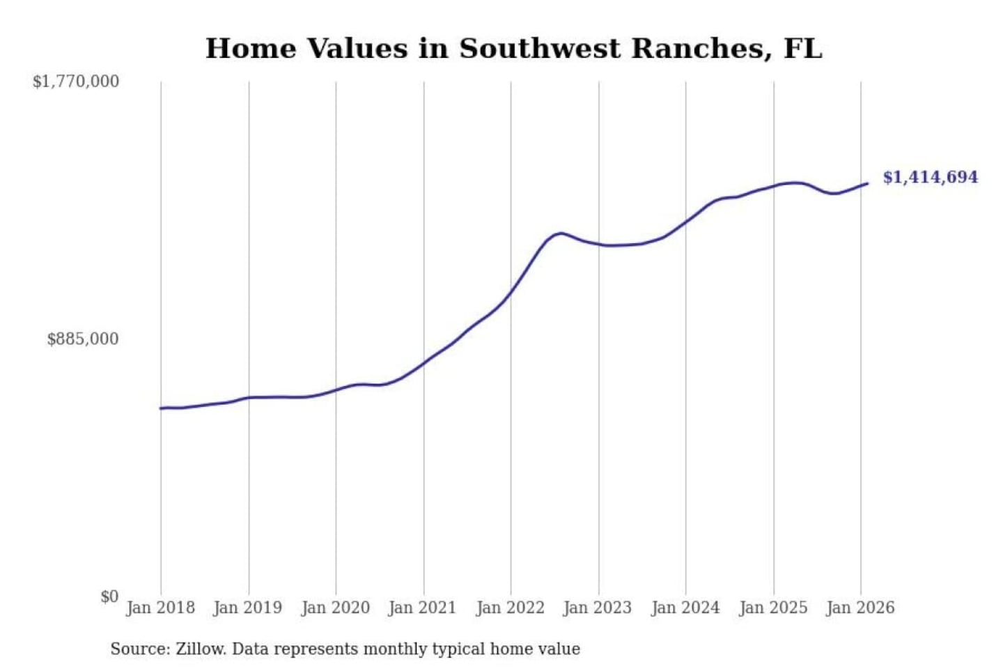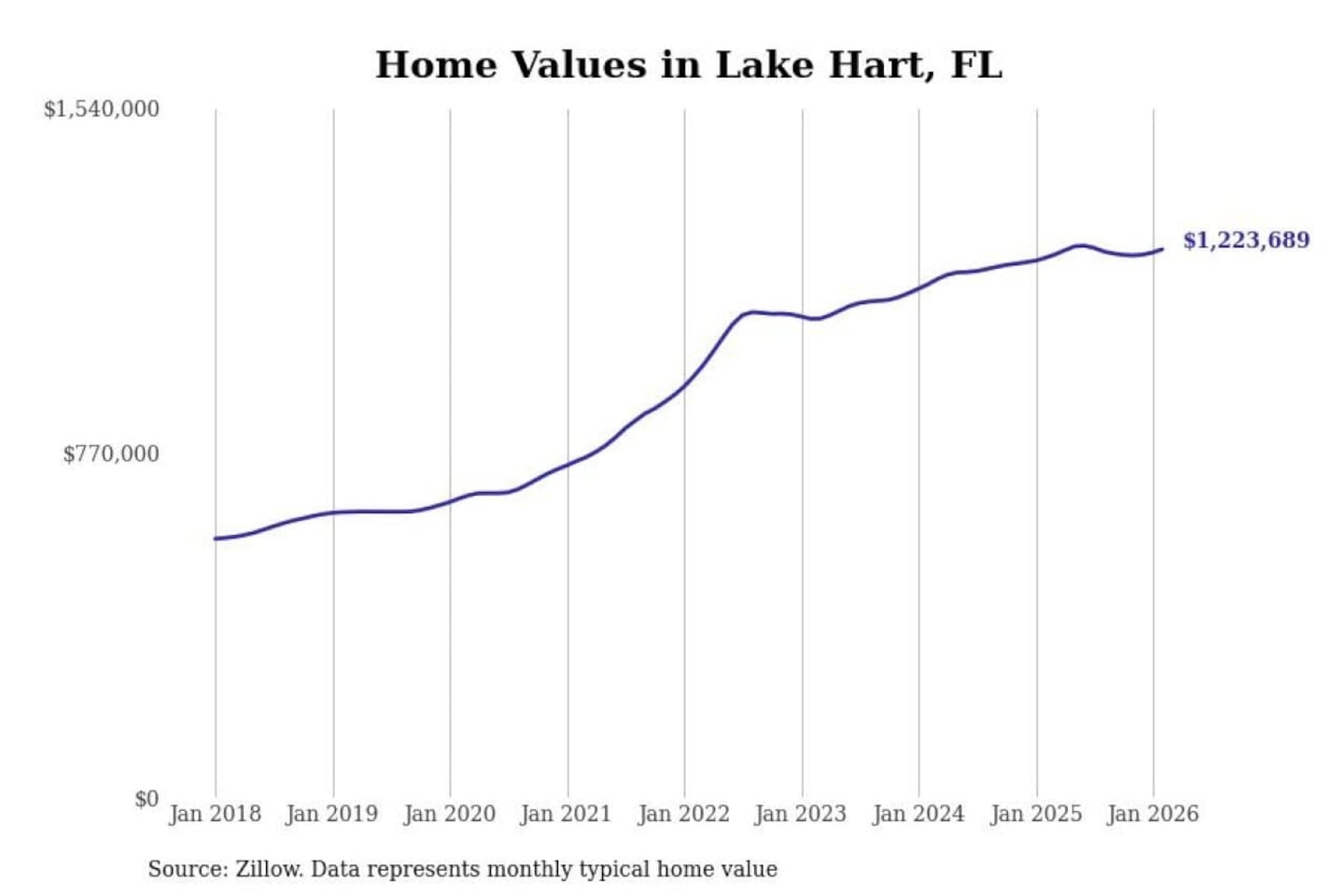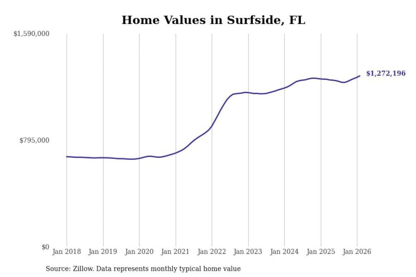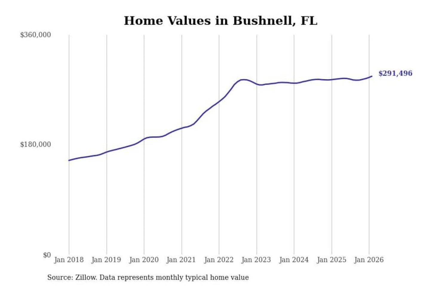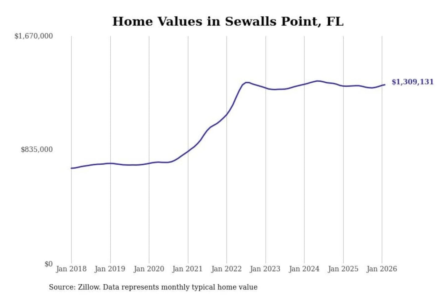 Stacker compiled a list of cities with the fastest-growing home prices in Florida using data from Zillow. Cities are ranked by the dollar change in the Zillow Home Values Index for all homes from the 12 months ending February 2026. The charts in this story were created automatically using Matplotlib. Data was available for 50 cities and towns in Florida.