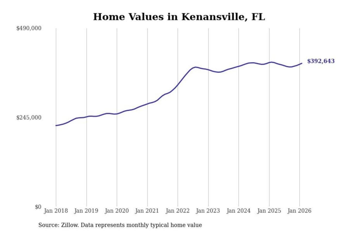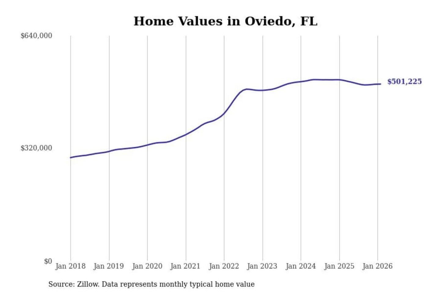 Stacker compiled a list of cities with the most expensive homes in the Orlando-Kissimmee-Sanford, FL metro area using data from Zillow. Charts show the monthly typical home value since January 2018.