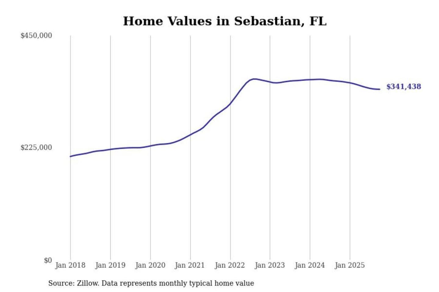 Stacker compiled a list of cities with the most expensive homes in the Sebastian metro area using data from Zillow. Charts show the monthly typical home value since January 2018. All 4 cities and towns with data available were included in the list.