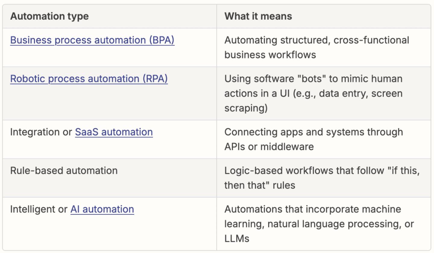 When looking for information on enterprise automation types, you may come across terms like business process automation (BPA), robotic process automation (RPA), and intelligent automation—especially in analyst reports or vendor materials. Here's a quick primer to help translate.