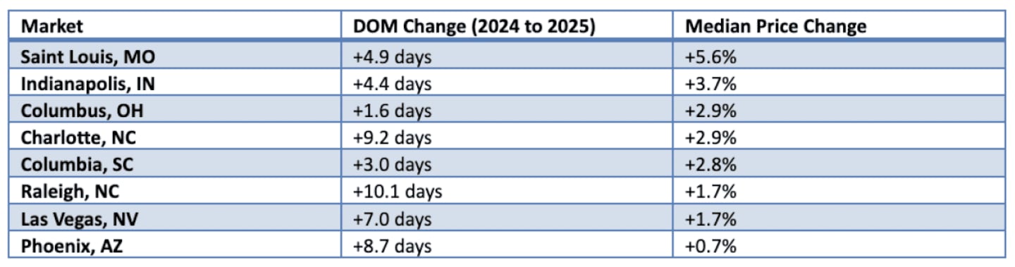 Eight of 15 markets saw median prices increase between 2024 and 2025, even as homes took longer to sell: