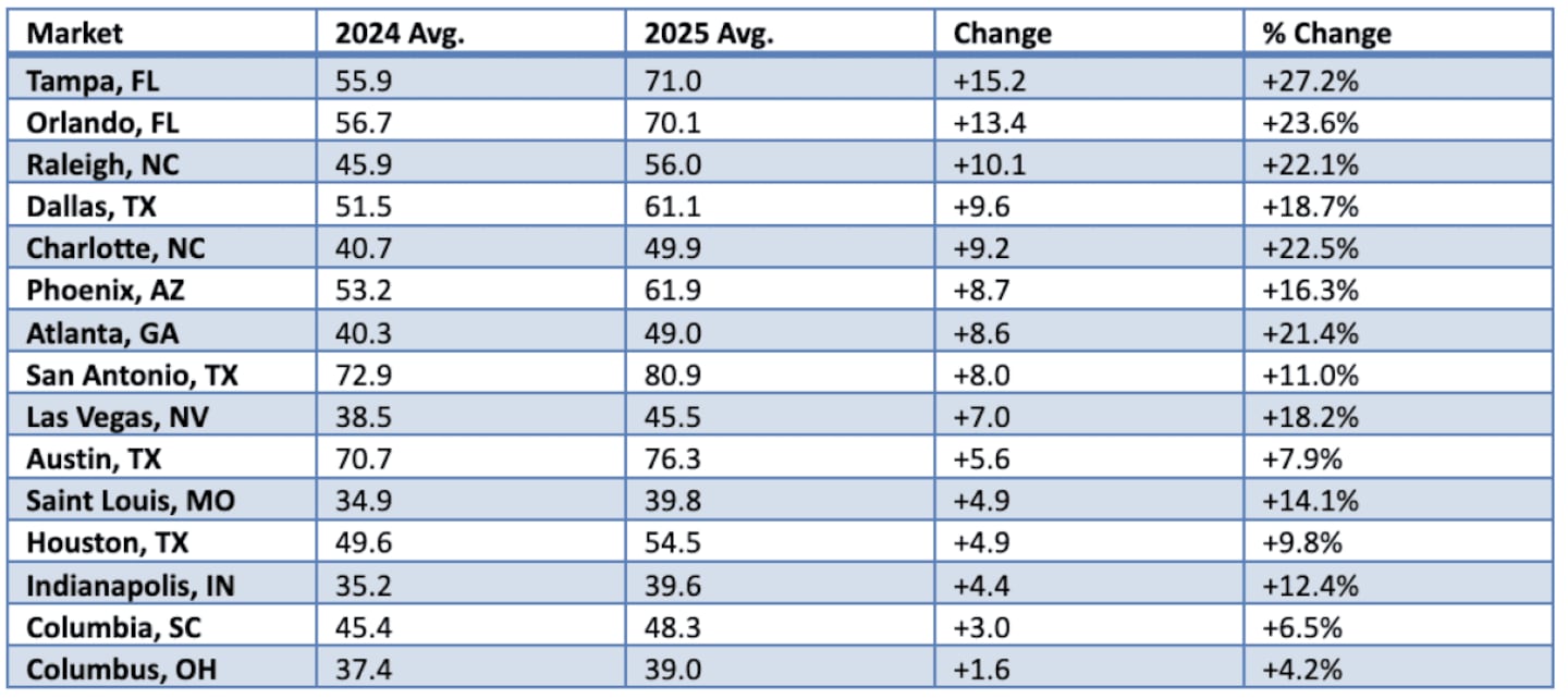 Markets analyzed: Atlanta, GA; Austin, TX; Charlotte, NC; Columbia, SC; Columbus, OH; Dallas, TX; Houston, TX; Indianapolis, IN; Las Vegas, NV; Orlando, FL; Phoenix, AZ; Raleigh, NC; Saint Louis, MO; San Antonio, TX; Tampa, FL.