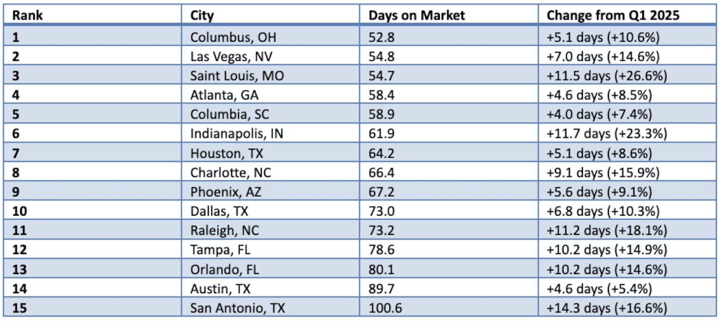 Every city on this list is slower than it was a year ago. The gap between the fastest market (Columbus at 53 days) and the slowest (San Antonio at 101 days) is nearly seven weeks.
