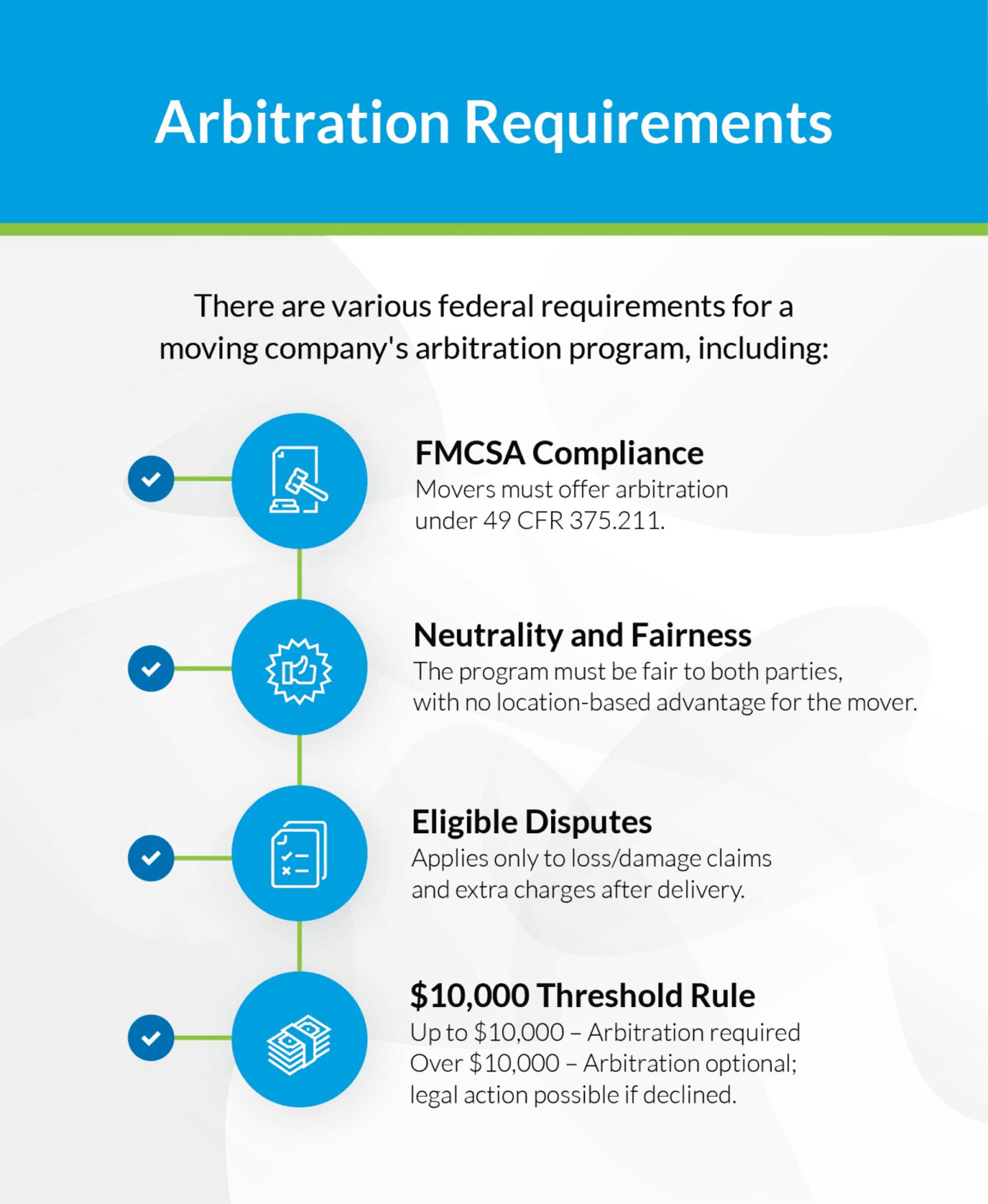 • Federal Motor Carrier Safety Administration (FMCSA): The FMCSA requires all interstate household goods movers to offer consumers an arbitration program under regulation 49 CFR 375.211.