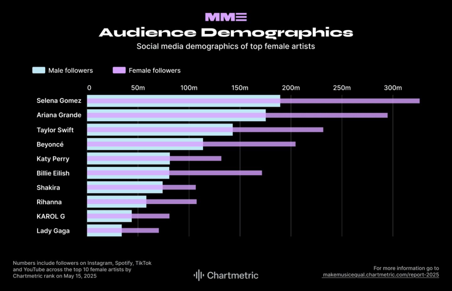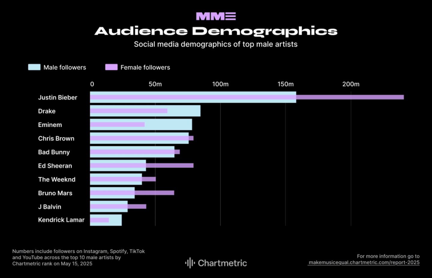 - Social audience: Numbers include followers on Instagram, Spotify, TikTok and YouTube as of May 15, 2025.