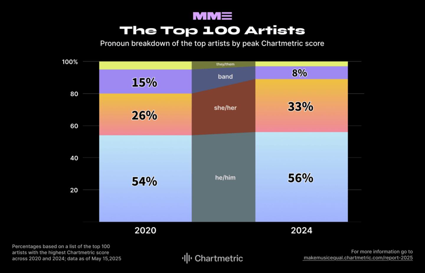- Track Releases: Percentages based on 2.9 million tracks released in 2020 and 3 million tracks released in 2024 from artists with pronoun information on Chartmetric.