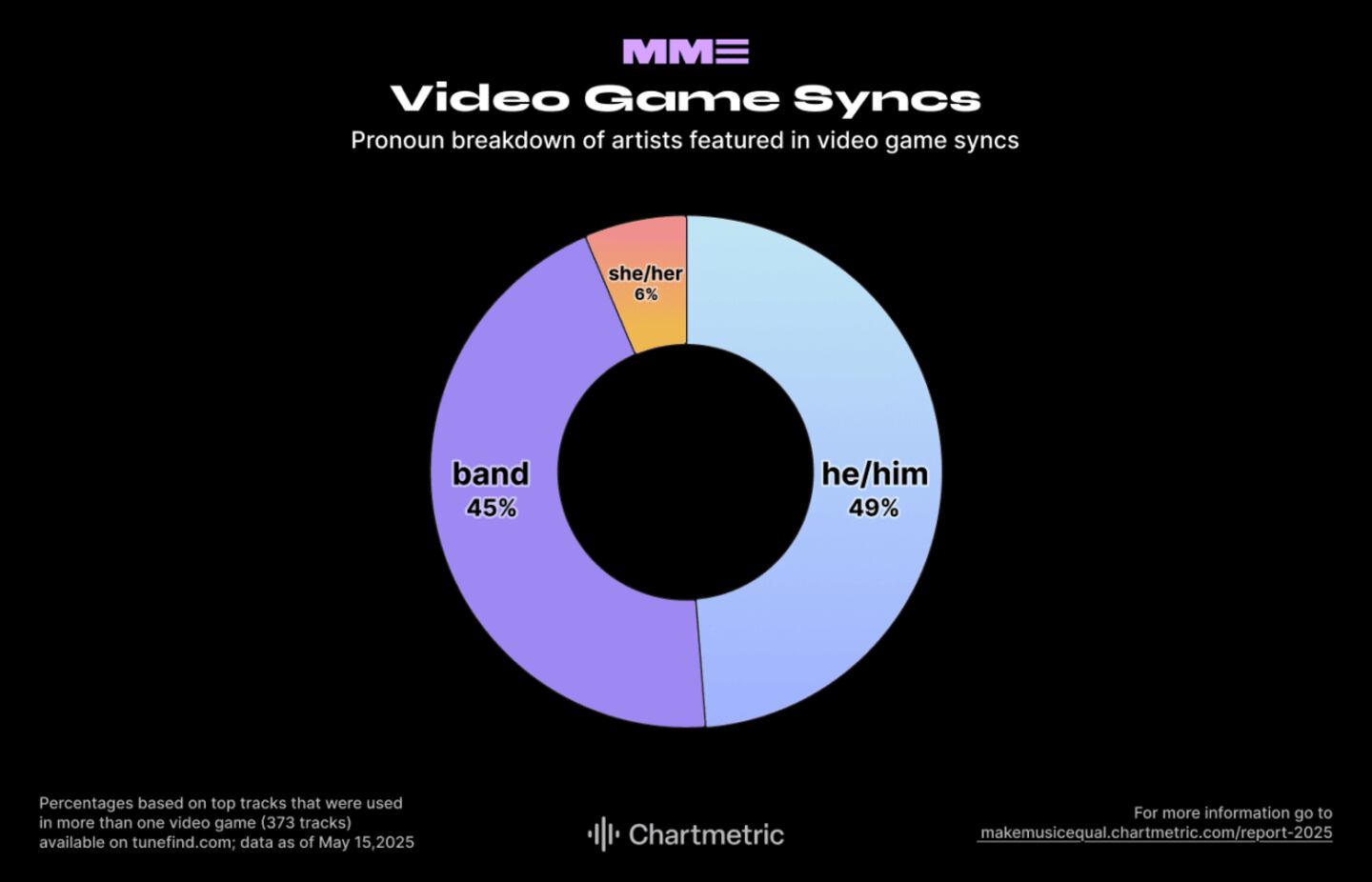 The most-used movie tracks are by 50% bands, 35% solo men, and 15% solo women. Of the three sync ecosystems, video games show the greatest gender disparity: 49% of featured solo artists are men, while only 6% are women.