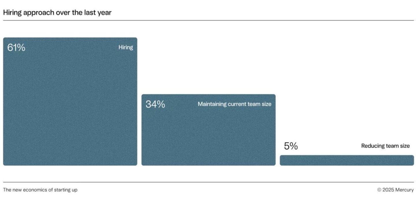 Despite fears that artificial intelligence will replace workers, some businesses using the technology are doing the opposite. A recent Mercury survey of 1,500 early-stage entrepreneurs found that 68% of AI adopters are expanding their teams, even as two-thirds of startups report higher-than-expected costs in operations, sales and marketing. Overall, 79% of founders said they plan to increase spending in the year ahead — underscoring resilience and a shift in how AI is shaping growth, Mercury reports.