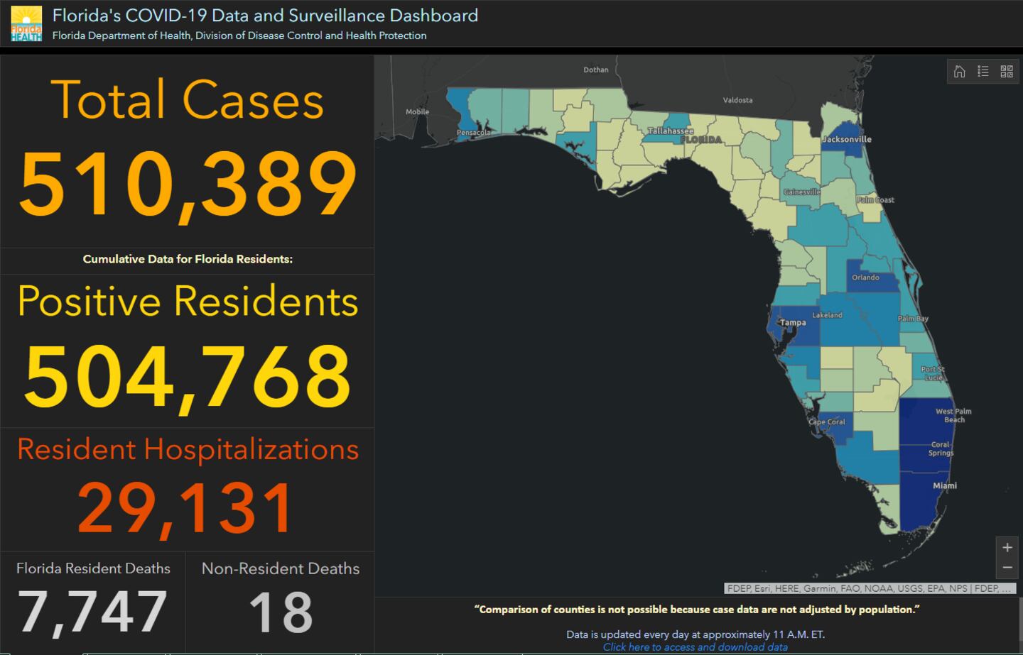 The latest COVID-19 numbers Thursday increased by 7,650, taking the state total to 510,389. Hillsborough County still leads the state with over 31,000 cases, For the latest information check with Dove Coronavirus site for the Florida Dashboard which is updated daily at 11 am, including the weekend. The Florida Department of Health also has the COVID-19 Call Center open 24/7 at 1-866-779-6121. You can also reach them by email at covid-19@flhealth.gov. Email responses will be sent during call center hours.