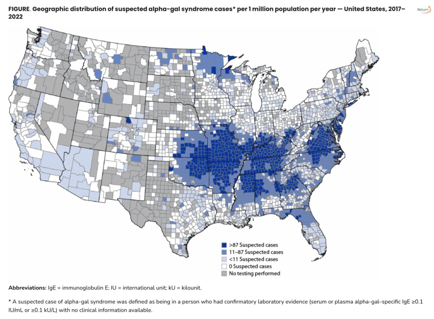 Source: Thompson JM, Carpenter A, Kersh GJ, Wachs T, Commins SP, Salzer JS. Geographic Distribution of Suspected Alpha-gal Syndrome Cases — United States, January 2017–December 2022 // CDC
