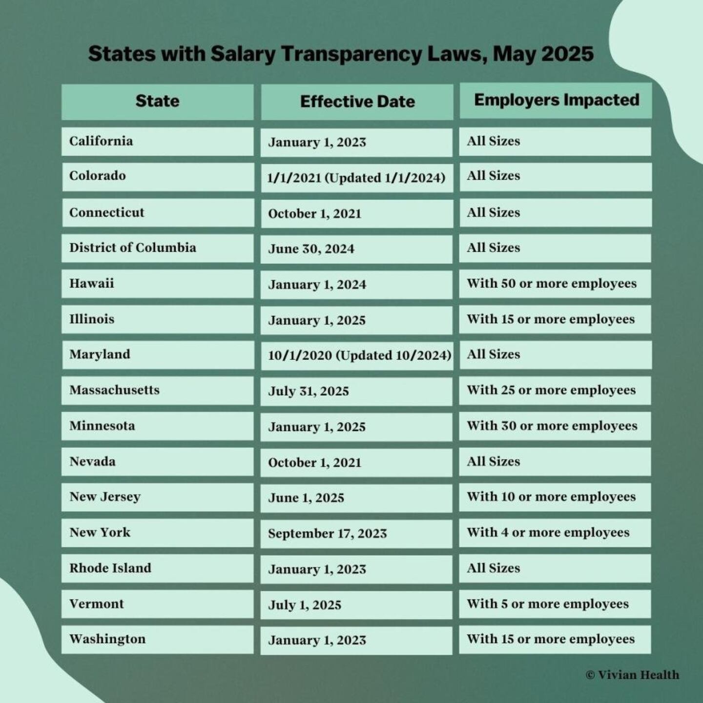 Currently, 14 states and the District of Columbia have laws regarding salary transparency already enacted or approved and set to go into effect in 2025. The following table shows all states with laws as of May 16, 2025, along with the effective dates, employers impacted and links to copies of the legislation.