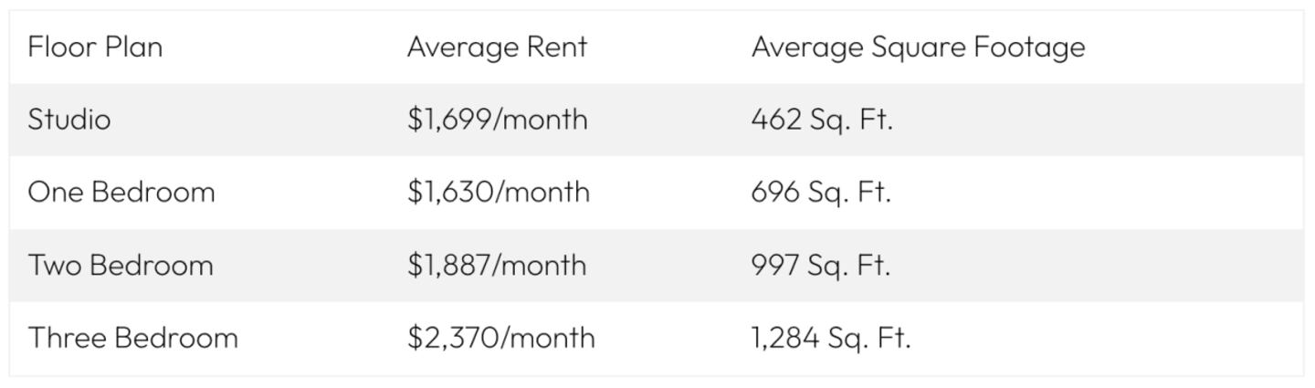 • Average One-Bedroom Size: 668 sq. ft.