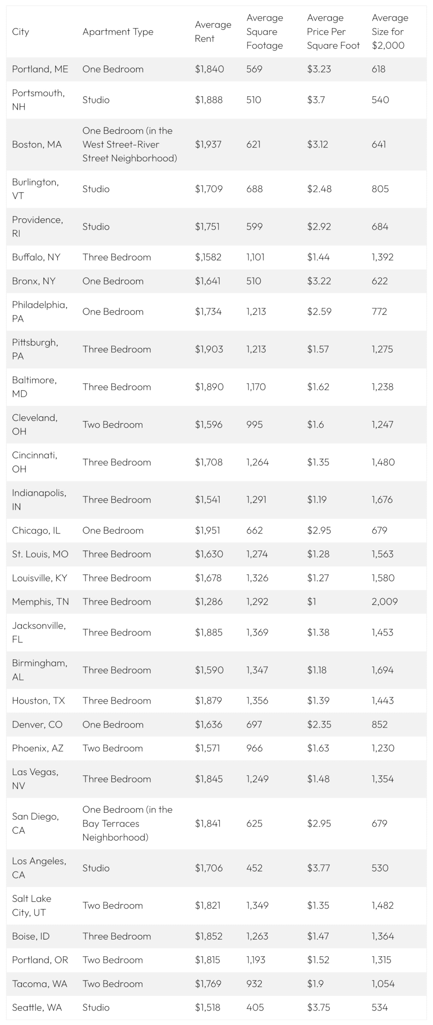 • Renters in smaller cities like Memphis, Buffalo, and Indianapolis can afford three-bedroom apartments within a $2,000 budget, while in big cities like Boston, Los Angeles, and Seattle, that same budget often only covers a studio.