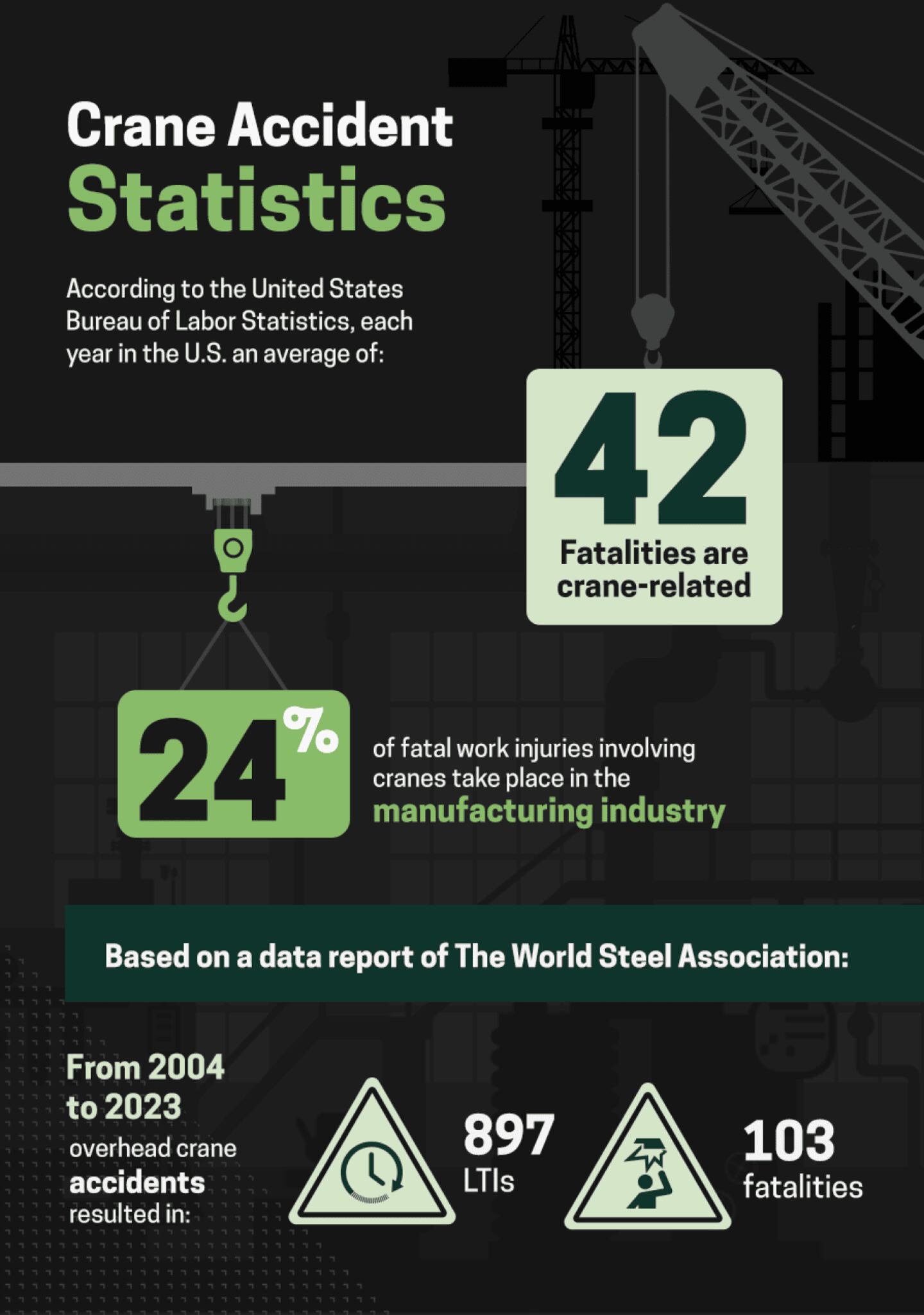 Some of the statistics for injuries and fatalities related to crane accidents reflect how severe they can be. The World Steel Association published a 2024 data report on safety and health in the industry. One of the datasets in the report examined the ratio between lost-time injuries (LTIs) and fatalities from 2004 to 2023. During this period, overhead crane accidents resulted in 897 LTIs and 103 fatalities.