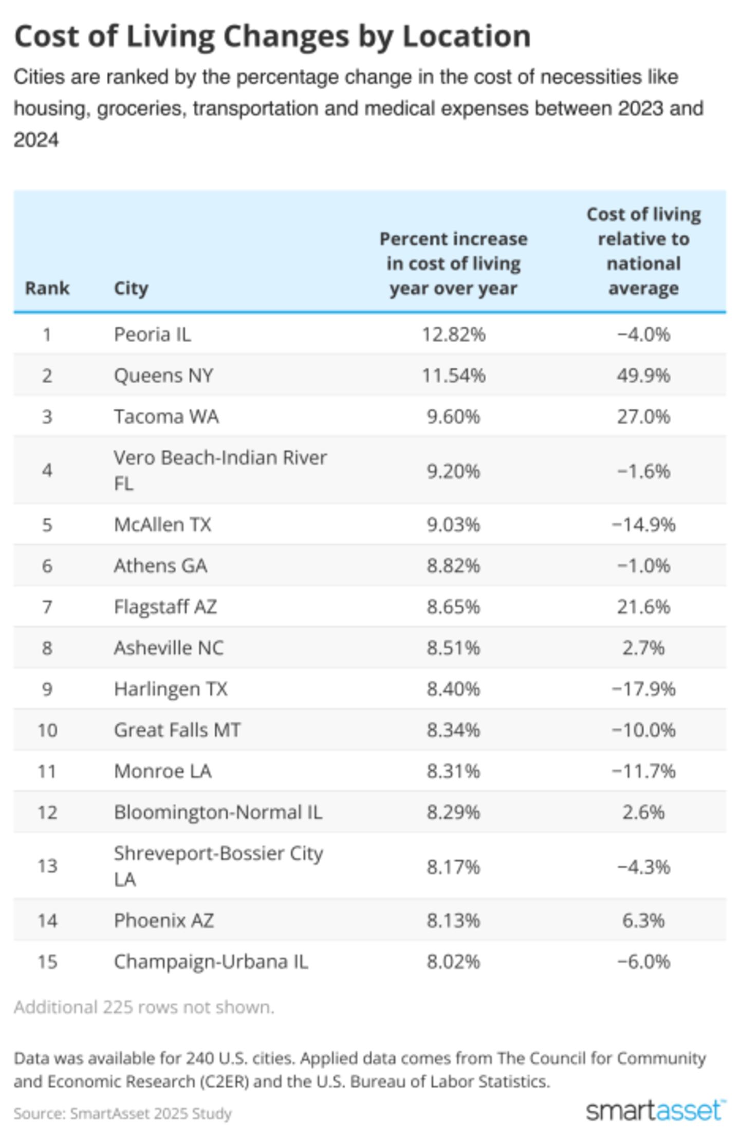 Using data from the Council for Community and Economic Research (C2ER), SmartAsset compared relative cost of living data for essentials—including housing, utilities, transportation, medical costs and more—across 240 cities with available data. Average cost data for 2023 was compared to that of 2024 after adjusting relative cost rankings for inflation to determine the percent increase in dollars needed to cover the designated basket of essentials. Relative costs to the national average were also observed.
