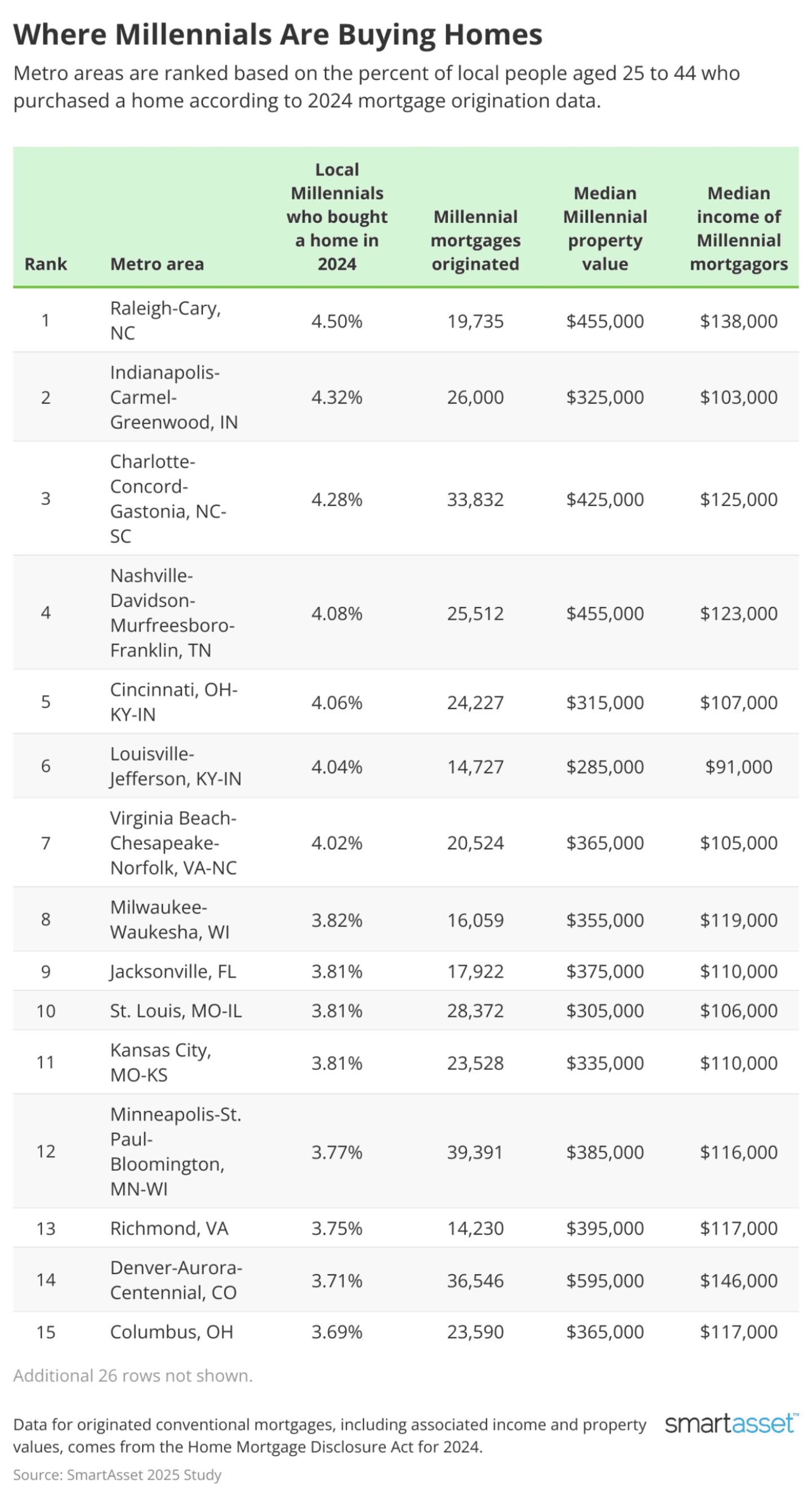 - Millennials are snatching up homes most quickly in the Raleigh-Cary, NC metro. 4.5% of residents aged 25 to 44 bought a home with a conventional mortgage in the Raleigh-Cary metro in 2024, the largest share studywide. A total of 19,735 conventional mortgages were issued to this age group, with the median property value at $455,000. These new homeowners have a median income of $138,000.
